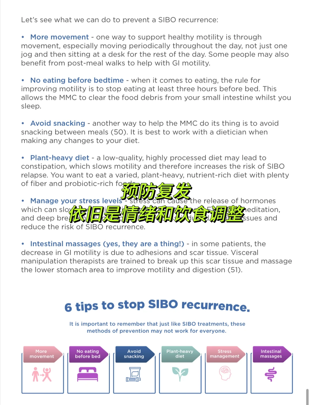 Sibo的治疗肯定不是一上来就杀菌!也不是一上来就吃一堆补充剂!更不是直接元素饮食! Root cause找到了吗?MMC修复的吗?诱因解决了吗?饮食做对了吗?压力有吗?…….. 每个人的情况不一样,找到有经验的专业人员帮助梳理病情,找到真正原因,有耐心的调理,总会变好的。