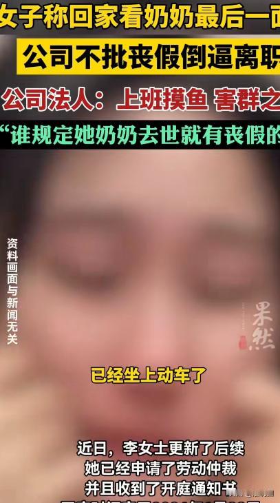 “比周扒皮还狠!”江苏常熟,一女子奶奶快不行了,留着一口气等着见她最后一面,她赶紧跟公司请了5天假回去奔丧,她都坐上高铁了,却接到人事通知,说公司法人不同意她请假,要么她自己辞职,要么就开除她。公司法人:上班摸鱼,害群之马,哪个企业能容下你?谁规定你奶奶去世就有丧假的,我就要开除你,你随便去告!女子大哭:公司没wifi,也没监控,你哪只眼睛看见我摸鱼了?你就是想“没任何成本”赶走我! 李女士从小便是奶奶带大的,对奶奶有着深厚的感情。她小时候父母工作繁忙,经常外出,奶奶不仅照顾她的生活起居,还在她成长过程中给予了无微不至的关怀。 奶奶是她生命中最亲近的人之一,甚至可以说是她童年的守护神。 事情发生在一个普通的工作日早晨,李女士正在办公室忙碌着整理报表,手机突然响起,是母亲打来的电话。 电话里,母亲声音颤抖,几乎带着哭腔:“你赶快回家,你奶奶快不行了,她留着一口气等着见你最后一面!” 李女士听到这句话,整个人都愣住了,心里像是被狠狠揪了一下。她几乎是瞬间站了起来,手里的笔和文件都掉在地上。她深吸一口气,眼泪差点就夺眶而出。 李女士知道,这种时候,她必须立刻回家。 她打电话给公司请假,原本以为会像平时一样顺利,因为紧急家事是公司通常可以理解的。她向直属领导说明情况,请求五天的丧假。领导的反应起初还算温和,表示会帮她提交请假申请。 李女士松了口气,收拾好行李,赶紧打车去高铁站,心里充满焦急和不安——每一秒钟都像是在和时间赛跑,她只想赶到奶奶身边,再多看奶奶一眼,再说一句再见。 就在她上了高铁,手机响起时,她的心彻底沉了下去——是公司人事的电话。 电话那头传来的声音冷冷的,几乎没有任何情感:“李女士,公司法人林某不同意你请假,要么你自己辞职,要么就开除你。” 李女士愣住了,手指握着电话的手都在微微颤抖:“凭什么?我奶奶快要走了,我只是请几天丧假,你怎么能不同意?” 电话那头,人事的语气更加冷漠:“法人说你是上班摸鱼,害群之马,哪个企业能容下你?谁规定你奶奶去世就有丧假的,他就要开除你,让你随便去告!” 李女士愣得说不出话来,眼泪一下子涌了出来。她看着车窗外飞速掠过的风景,心里翻江倒海——奶奶或许正在等她,而公司却把她置于这种境地。 她忍不住在心里质问自己,也质问这个世界:“难道我对奶奶的孝心,在他们眼里就是‘害群之马’吗?难道我回家奔丧,会被视作‘摸鱼’吗?” 回想起在公司里的日常,李女士感到更心寒。她所在的部门没有监控,没有打卡机,公司甚至连基本的考勤系统都很松散。 她每天早出晚归,几乎没有偷懒的机会,也没有一点可以“摸鱼”的空间。 她一直是默默完成工作任务的人,项目进度、数据整理、客户沟通……都是她的日常。她更不明白,公司法人凭什么以毫无证据的指控,将她逼到辞职或者开除的地步。 高铁上,李女士不停地擦眼泪,拿出手机翻看以前和奶奶的视频、照片,心中充满了遗憾与焦虑。 她甚至想着,如果再晚一步,可能连最后一面也见不到奶奶了。心里那份紧张和无助让她几乎崩溃。 事情传到网络上后,网友们的反应异常激烈。很多人感叹:“这简直是资本家的无情操作!员工的家庭和人情怎么可以被这样践踏?” 还有网友分析道:“企业管理是有规章制度的,但这事明显是人情与法律的基本底线问题。员工家中有亲人离世,本应得到人性化对待,怎么能用‘摸鱼’这种毫无依据的理由威胁人?” 有人评论说:“李女士没错,奶奶快要走了,这种时候家人比工作更重要。公司法人的态度完全是冷血,难道员工不是人吗?不是有感情吗?” 也有网友讲述自己的经历:“我也遇到过类似情况,上级用各种理由拒绝请假,结果就是员工被逼得离职,这种环境真的让人心寒。”