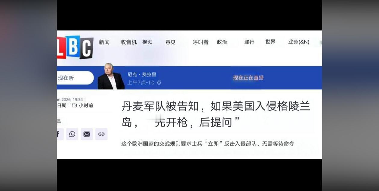 英国媒体LBC(成立于1973年的老牌新闻广播媒体)在一月七日的报道中透露,若美国入侵格陵兰,丹麦军队将"先开火,后提问",丹麦倘若遭受军事攻击,部队将进行反击且无需等待上级命令。而根据路透社最新的消息,美国考虑以人均一万到十万美元不等来收买格陵兰居民。