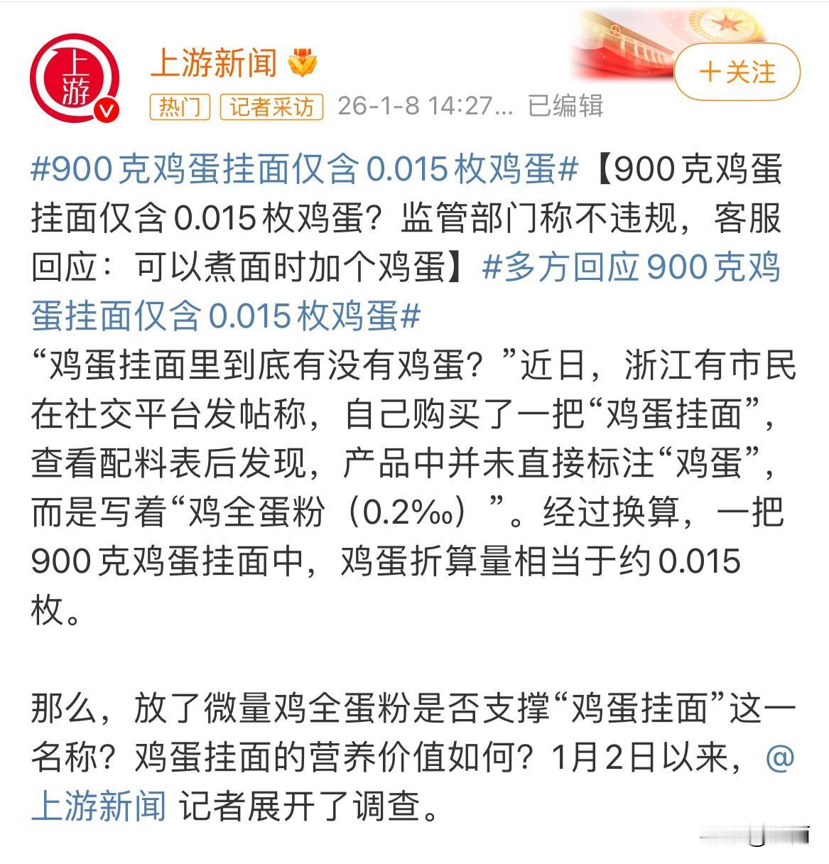 破防了。爱吃鸡蛋挂面的人伤心了。 浙江一网友买了一把900克的鸡蛋挂面,查看配料表却发现鸡全蛋粉只有千分之0.2的含量,这一把挂面只有0.015个鸡蛋,也就是说买上一百把挂面才能吃到1个半鸡蛋。 专家直言,这个所谓的鸡蛋挂面就是一个噱头,这样的添加比例,鸡蛋的营养可以忽略不计。 厂家客服表示,鸡蛋挂面里面有鸡蛋,但不多,建议消费者在煮挂面的时候可以再打上鸡蛋来加强营养。 而对于鸡蛋含量如此低,却依然叫鸡蛋挂面是否涉嫌欺骗的问题,当地监管部门工作人员称,这个不存在欺骗,因为对于绝大多数人而言,约定俗成了“这一把鸡蛋挂面里不会放一个鸡蛋”。所以,他认为,“一般不构成虚假宣传”。
