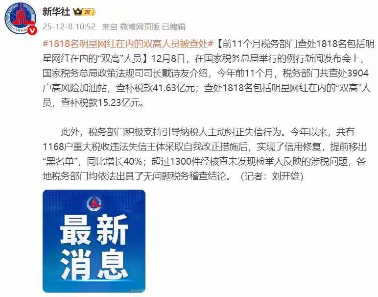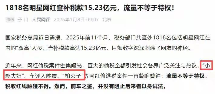 惊天补税风暴!1818位明星网红15亿税款背后,是普通人996工资条上的无声呐喊与税收公平的最后防线! 当一则来自国家税务总局的通报悄然发布,整个互联网仿佛被投入了一颗深水炸弹。2025年前11个月,1818名明星、网红等高收入者因偷逃税被查处,查补税款高达15.23亿元。这个数字,像一把锋利的刀,划开了流量时代金碧辉煌的表象。 我们每天挤着地铁,对着工资条上被扣除的个税数字精打细算,每一分都是早出晚归的汗水。而屏幕那端,有人一场直播收入堪比普通人一生,却仍在绞尽脑汁,将本应属于社会的财富藏进隐秘的角落。这种对比,何止是刺痛,更像是一种沉默的嘲讽。 从“小影夫妇”到车评人陈震,再到“柏公子”,名单上的名字不断更新,手段却大同小异。隐匿收入、转换性质、虚假申报,甚至利用空壳工作室玩起税务魔术。他们享受着时代最大的红利,住豪宅、开豪车,却试图逃避最基本的社会责任。这不是简单的贪婪,这是对规则赤裸裸的蔑视。 当偷税从个体行为演变为MCN机构组织化的操作,当数百名主播在系统策划下共同违规,我们看到的已不是个别蛀虫,而是某个生态环节出现了腐朽。流量为王的口号下,是否早已异化为“流量即特权”的错觉?法律的红线,在巨大的利益面前,竟被当成了可以试探的橡皮筋。 这十五亿税款,究竟是什么概念?它足以建造数十所希望小学,铺设上百公里乡村公路,或为无数大病家庭托底。这些本应流动在社会血脉中的养分,却一度滞留在少数人的私囊里。税收的本质是取之于民、用之于民,而当源头被悄悄截流,受损的是整个社会的公平肌体。 监管的铁拳正在落下。税务部门与平台数据打通,每一笔打赏、每一单带货都留有痕迹。大数据稽查如同天眼,让那些复杂的股权架构、隐秘的私人账户无所遁形。从“事后追缴”到“事前预警”,防线正在不断前移,压实平台和机构“看门人”责任的时代已经到来。 然而,重罚不是目的,规范才是终点。行业需要的不只是一场风暴,更是一套持久的免疫系统。为中小主播提供清晰的税务指引,优化税收征管流程,让合规变得简单,让违法成本高昂,才能引导行业从野蛮生长走向阳光繁荣。 我们捍卫的不是仇富情绪,而是最基本的公平原则。每一个依法纳税的普通人,都在用自己微薄的力量支撑着社会的运转。那些被流量捧上云端的人,没有资格凌驾于这份共同契约之上。他们的舞台是公众赋予的,他们的财富来源于社会关注,依法回馈,是天经地义。 这场补税风暴,像一面镜子,照出了光环下的阴影,也照见了普通人心中对公平最质朴的渴望。它不仅仅是一个经济事件,更是一次对社会价值观的集体叩问:我们究竟允许怎样的财富故事在这片土地上发生?答案,就在每个人心中的那杆秤上。 (来源:综合自国家税务总局通报、新华社、人民网及相关媒体报道) 税务风暴 网红经济