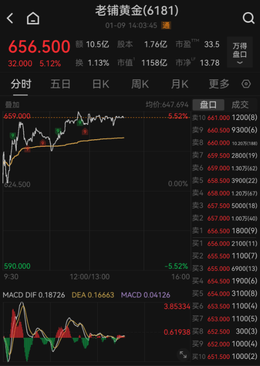 上证报中国证券网讯(记者何漪)1月9日,老铺黄金表现活跃。截至14点03分,老铺黄金涨5.12%,报656.5港元/股,成交额超过10亿港元。