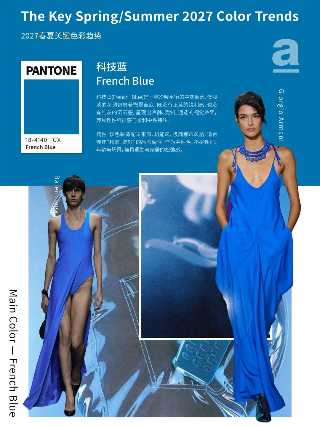 该色彩是冷暖平衡的中灰调蓝,低饱和特质让其兼具科技感与柔和感,不张扬却自带高级肌理,既适合醋酸连衣裙、挺括衬衫的极简通勤风,还能适配机能风外套的未来感造型。