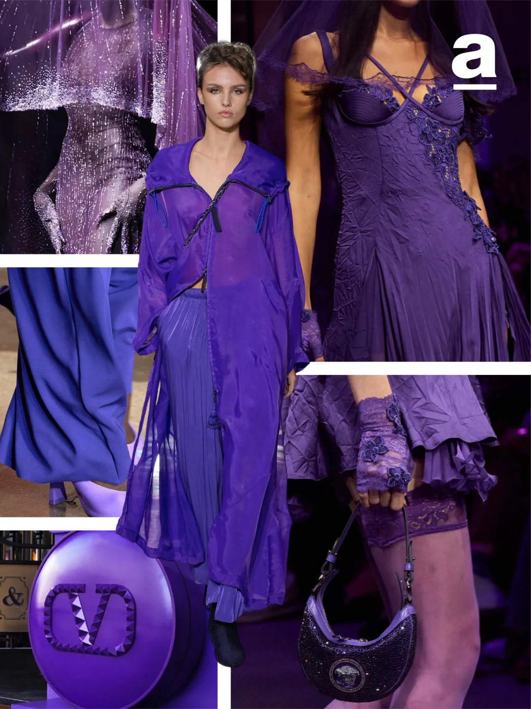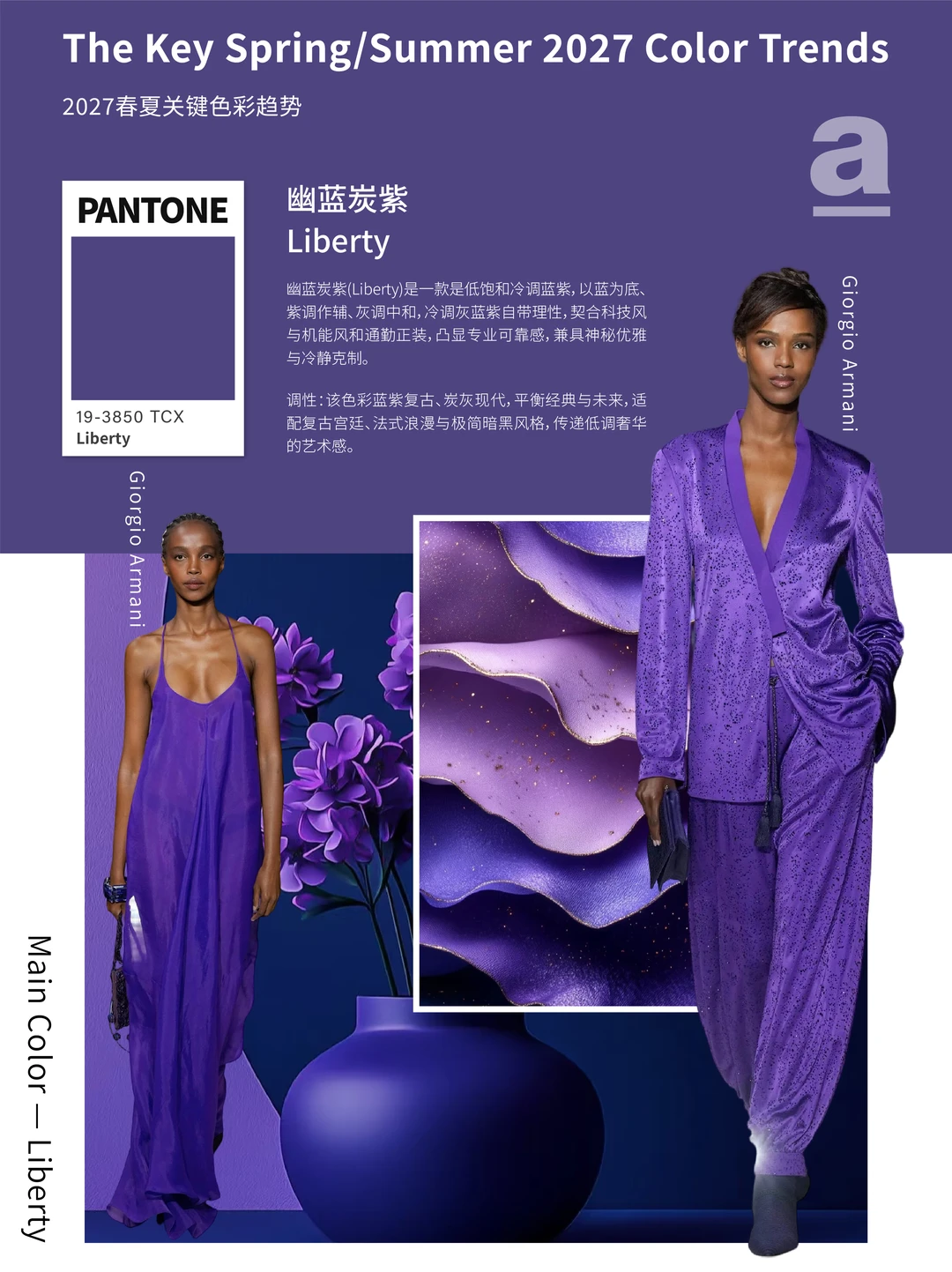 该色彩是2027SS暗黑极简风的核心色彩,以蓝为底、紫调作辅、灰调中和,呈现出哑光低彩的深邃通透质感,自带神秘优雅的强大气场,丝绒礼服穿它显晚宴高级感,粗纺花呢外套、高腰直筒裤则能穿出通勤利落感。