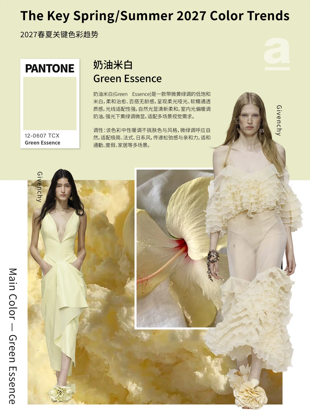 该色彩是2027SS静奢风的“打底王者”万能中性色,微黄绿调中和了纯白的冷感,呈现出柔光哑光的软糯质感,温和不挑肤色、包容所有风格,搭配冷调深色还能弱化沉闷感,让造型更显通透。
