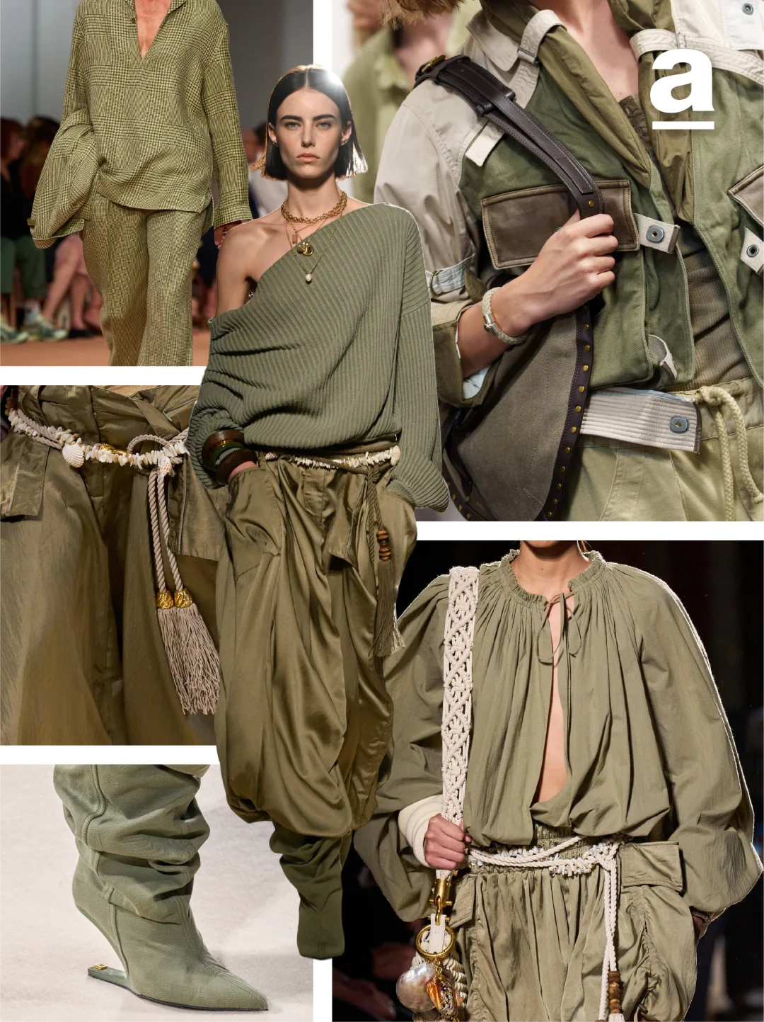 该色彩是低饱和橄榄绿与米棕的融合,自带复古工装肌理感,暖调温润不刺眼,兼具自然质朴与沉稳气质,适配浪漫户外风,不管是亚麻混纺衬衫、工装半裙还是户外露营外套都能穿出松弛氛围感。