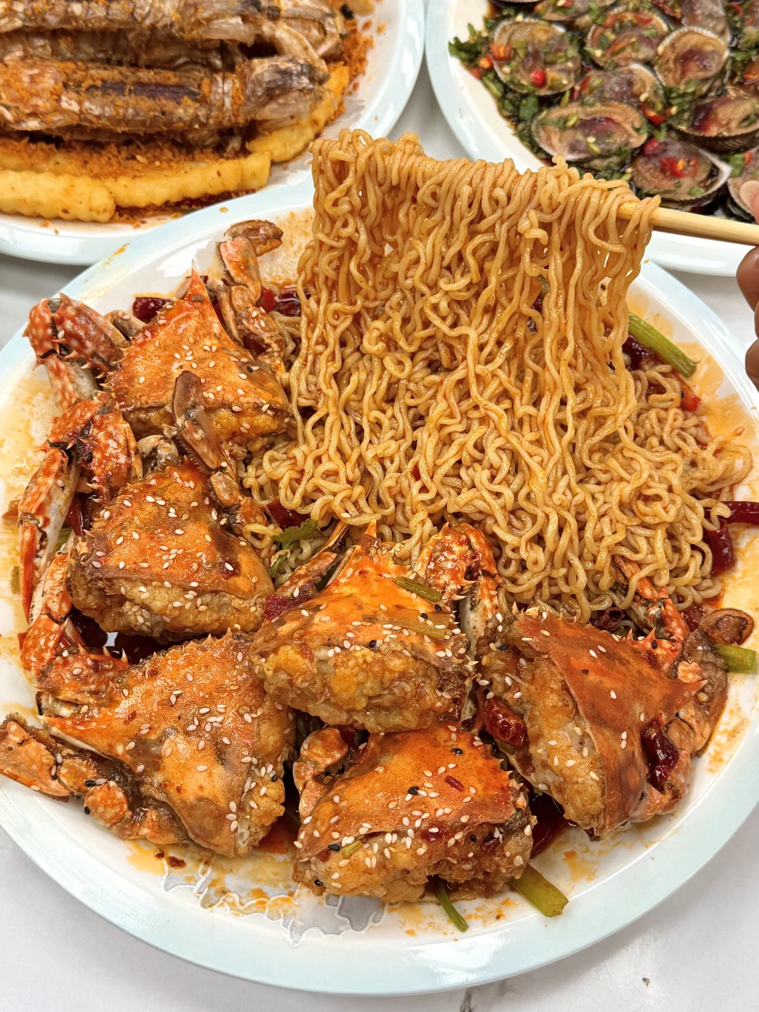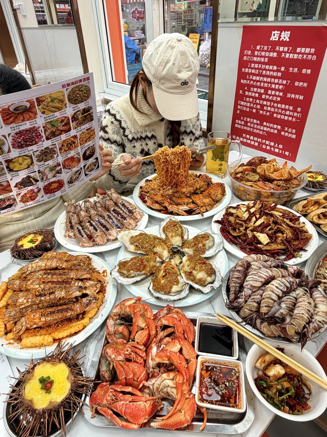 果然还是本地人推荐的小破店🐮!! 这周来青岛都吃三次了!藏在台东步行街,叫:旺角海鲜啤酒屋,一个不起眼的巷子里……虽然店不大但是味道没得说!听口音就知道来吃的都是本地回头客,真的座无虚席 爆籽笔管、虾怪、海胆蒸蛋都好好吃啊……还有香辣蟹拌面,每次都和室友一人一筷子抢着吃~特别香辣过瘾😭菜品分量都好大一盆,人均才50多还要啥自行车啊