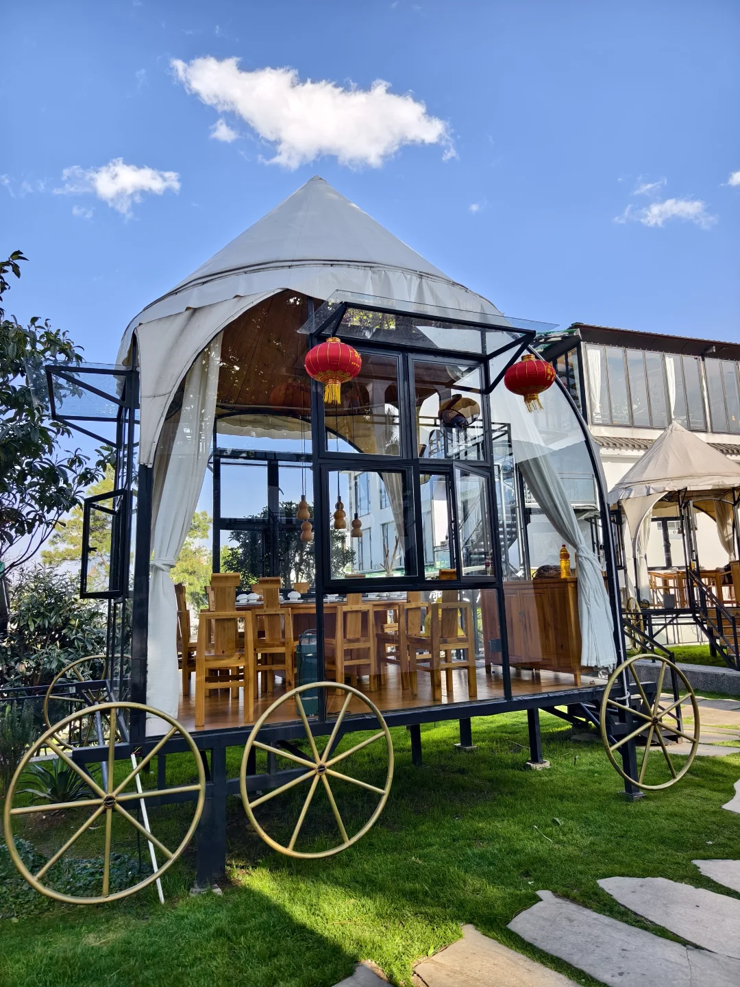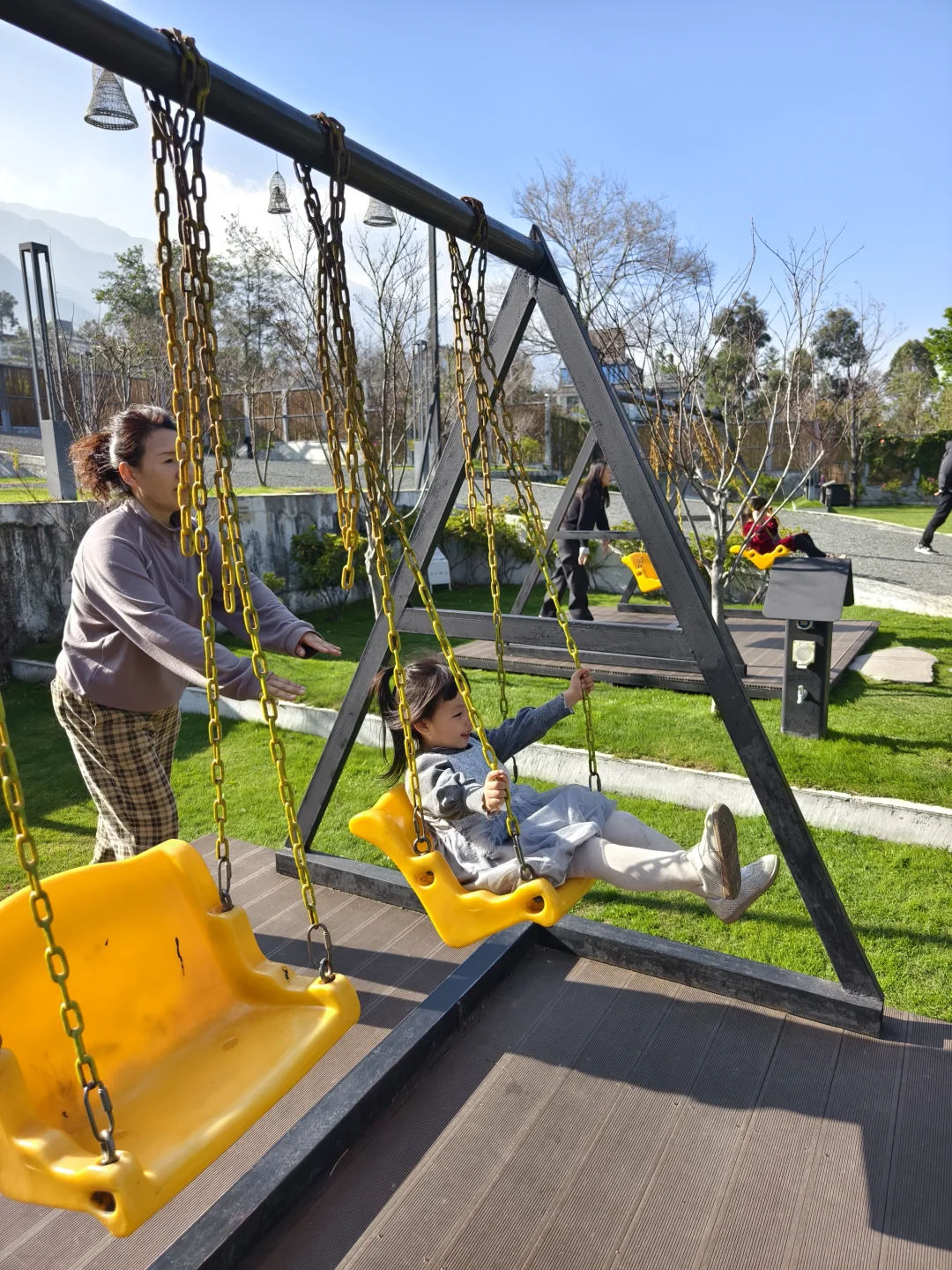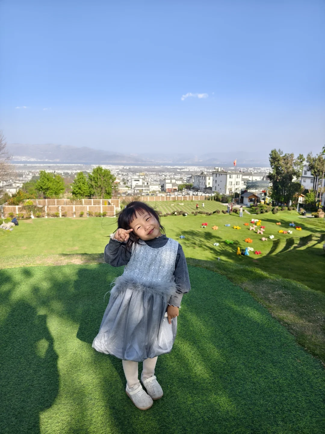 下午前往云禾壹海景庄园,就在苍山脚下。这是一个背靠苍山、俯瞰洱海的亲子空间。孩子们可在宽阔草坪奔跑,玩滑梯、秋千,家长在咖啡厅休憩观景。晚餐可以在设计成玻璃马车的漂亮房子里享用,亲测价格、味道都很过关