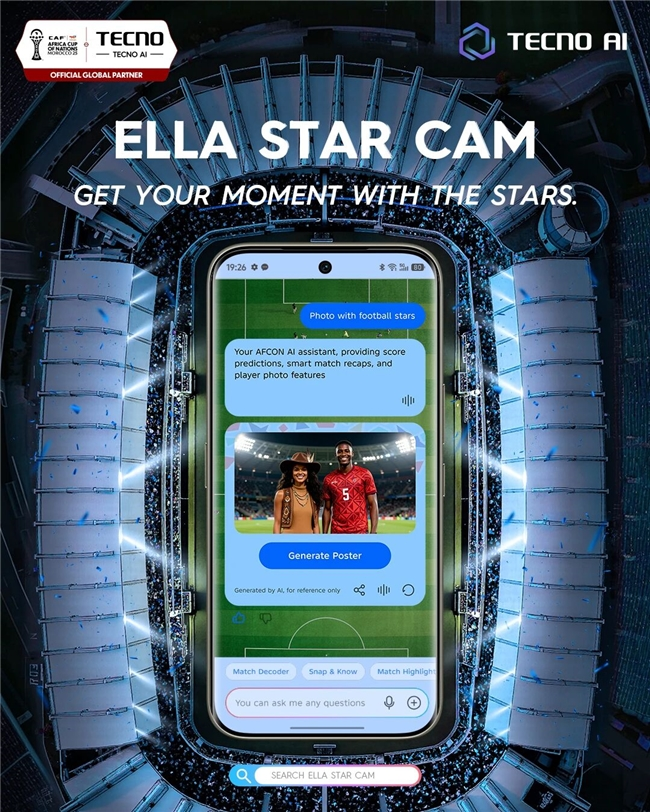 2025年的非洲杯不仅是足球的狂欢,也成为了TECNO展示其前沿AI技术本地化应用的绝佳场景。赛事期间,TECNO围绕智能助手Ella为核心,为球迷打造了一系列创新AI功能,将手机变为智慧观赛伴侣:EllaMatchDecoder(AI战术大师),提供实时战术分析与智慧洞察;EllaDailyHighlight(AI赛事助手),自动生成个性化精彩瞬间集锦;EllaStarCam(球星合影),拉近球迷与球星的距离。这些功能紧密契合观赛、社交等真实场景,切实提升了用户体验。