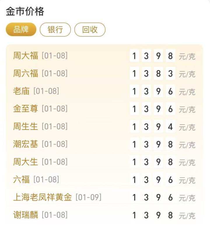 今天,各大金饰品牌的实时报价再次接近1400元/克。比如周大福、潮宏基、周大生、谢瑞麟的报价为1398元/克。其他品牌报价从1383元/克至1396元/克不等。