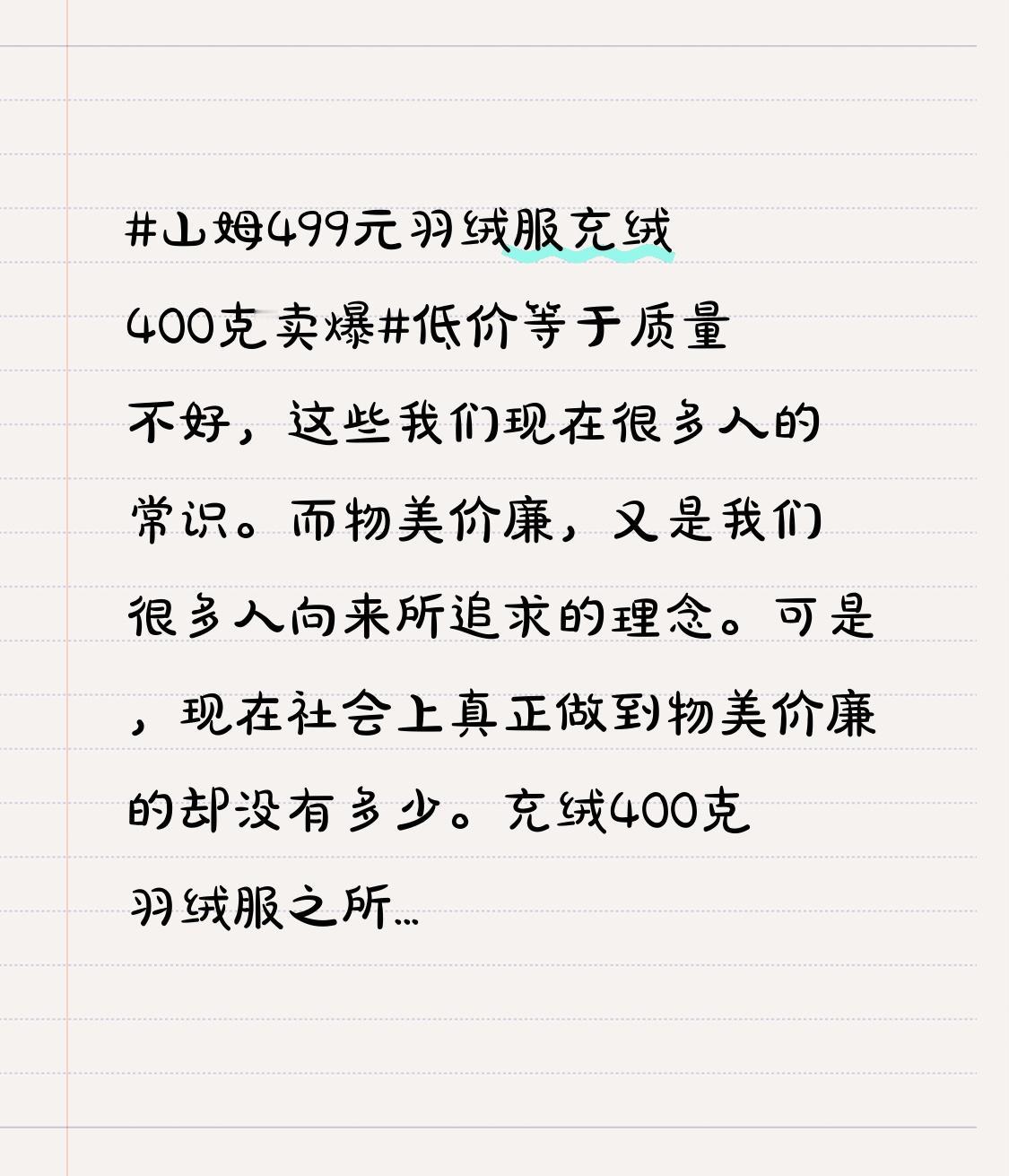 充绒400克羽绒服之所以卖爆,主要它刚好符合我们国人所追求的理念。同时也反应出,大家不是不愿意消费。只是不再想被人割韭菜,真正遇到物美价廉的东西。大家还是愿意出手的!只有我觉得山姆超市的东西贵吗? 超市羽绒服为啥这么火