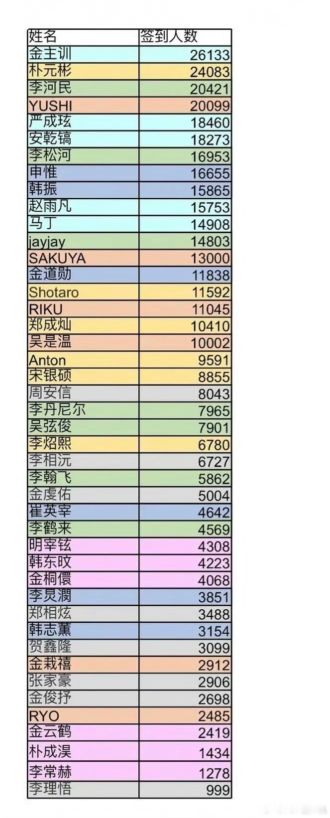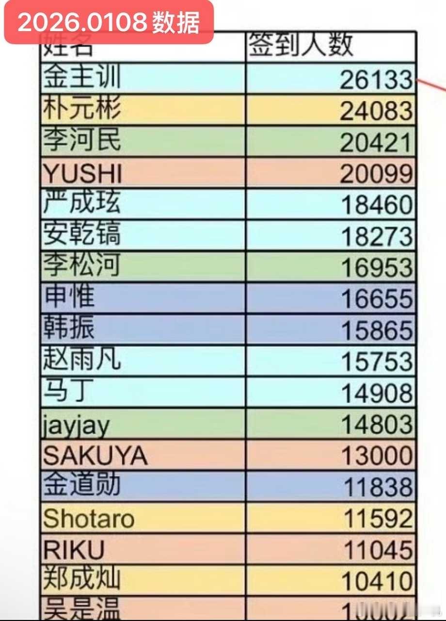 六代男2025.10月到2026年1月签到数据变化,金主训朴元彬持续领先中。