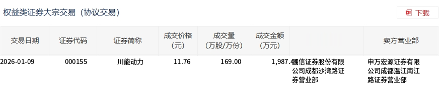 1月9日,川能动力大宗交易成交169万股,成交额1987.44万元,占当日总成交额的4.05%,成交价11.76元,较市场收盘价12.37元折价4.93%。