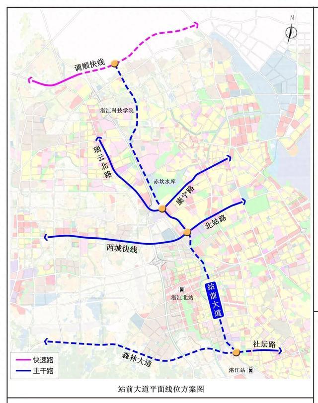 站前大道起于规划调顺快线,沿新坡上村和湛江科技学院东侧布设,后向西南侧沿着黎湛铁路东侧平行敷设,接入现状康宁路与站前路口,利用现状站前路向南,下穿现状湖光快线和广湛高铁跨线桥,从后坡村和挖尾村中间穿越,后沿黎湛铁路东侧平行敷设至规划森林大道。