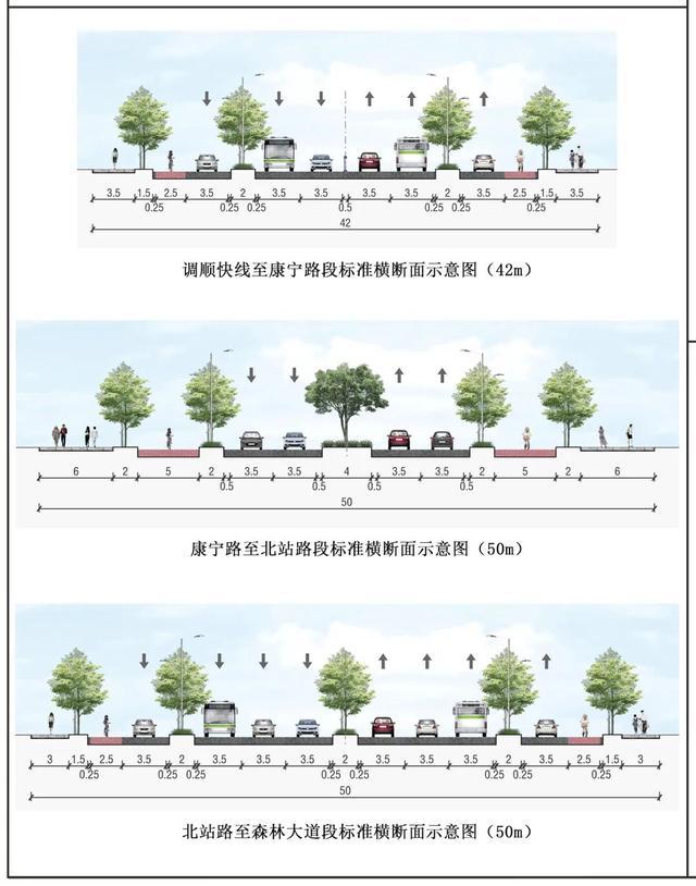 调顺快线-康宁路段:红线宽42m,三块板,双向4车道+双侧辅道+非机动车道;康宁路-北站路段:红线宽50m,维持现状断面,双向4车道+双侧非机动车道;北站路-森林大道段:红线宽50m,四板块,双向6车道+双侧辅道+非机动车道。