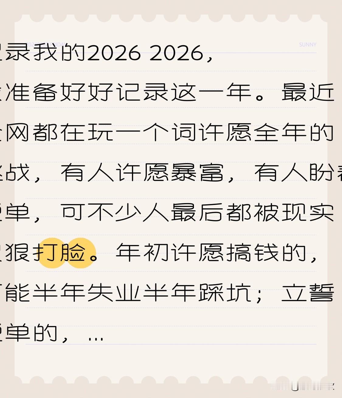记录我的2026 2026,我准备好好记录这一年。 最近全网都在玩一个词许愿全年的挑战,有人许愿暴富,有人盼着脱单,可不少人最后都被现实狠狠打脸。年初许愿搞钱的,可能半年失业半年踩坑;立誓脱单的,相亲相到怀疑人生。其实,困住我们的往往是必须做到的执念。 有博主用“接纳”做关键词,接纳自己的普通和努力后的不尽人意,年底竟攒下小金库,收获美好恋爱。我许愿2026能“松弛”度过,不被目标束缚,慢慢变好,同时好好记录生活里的点滴。