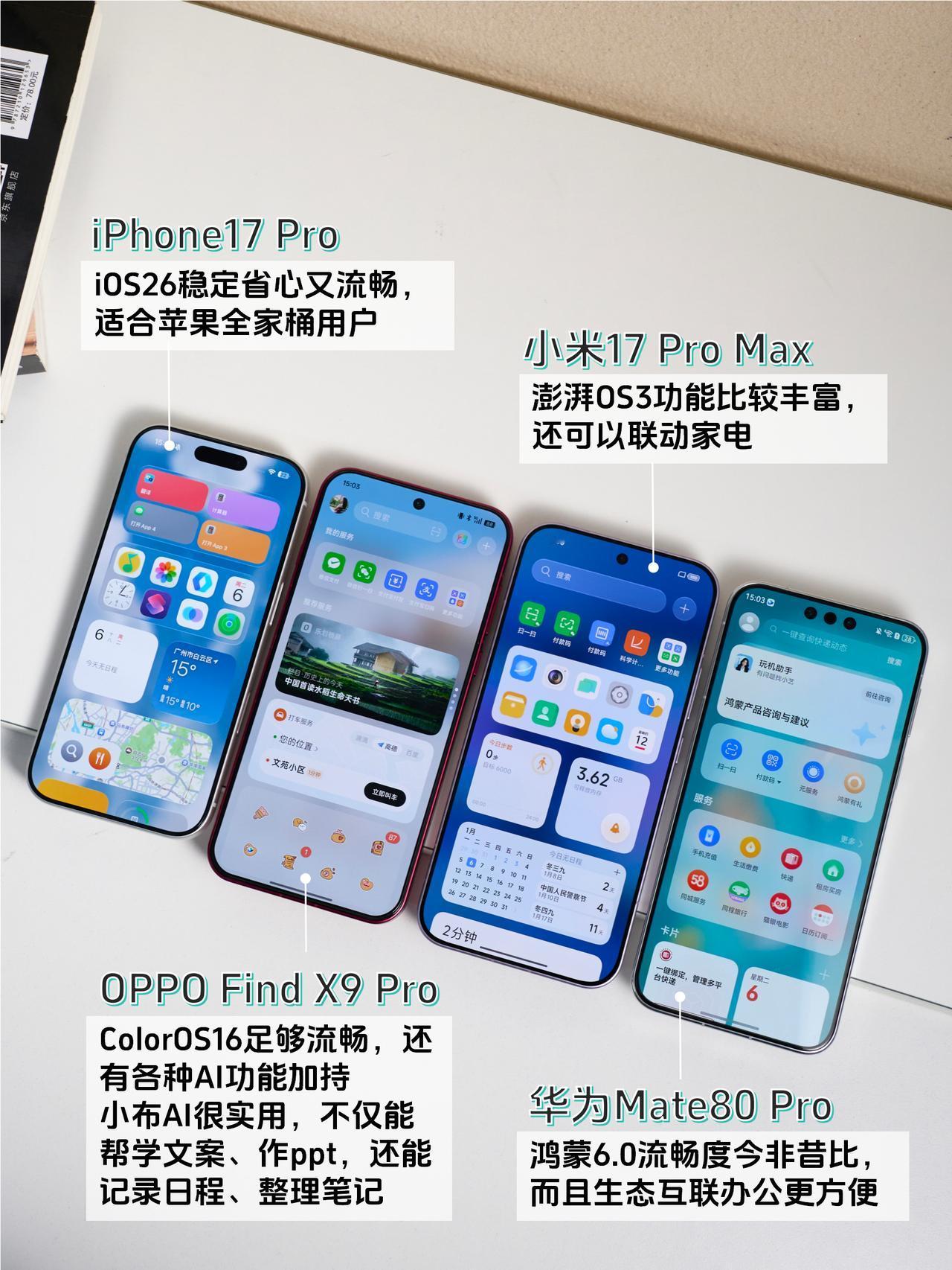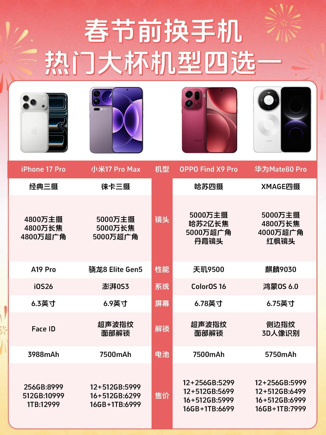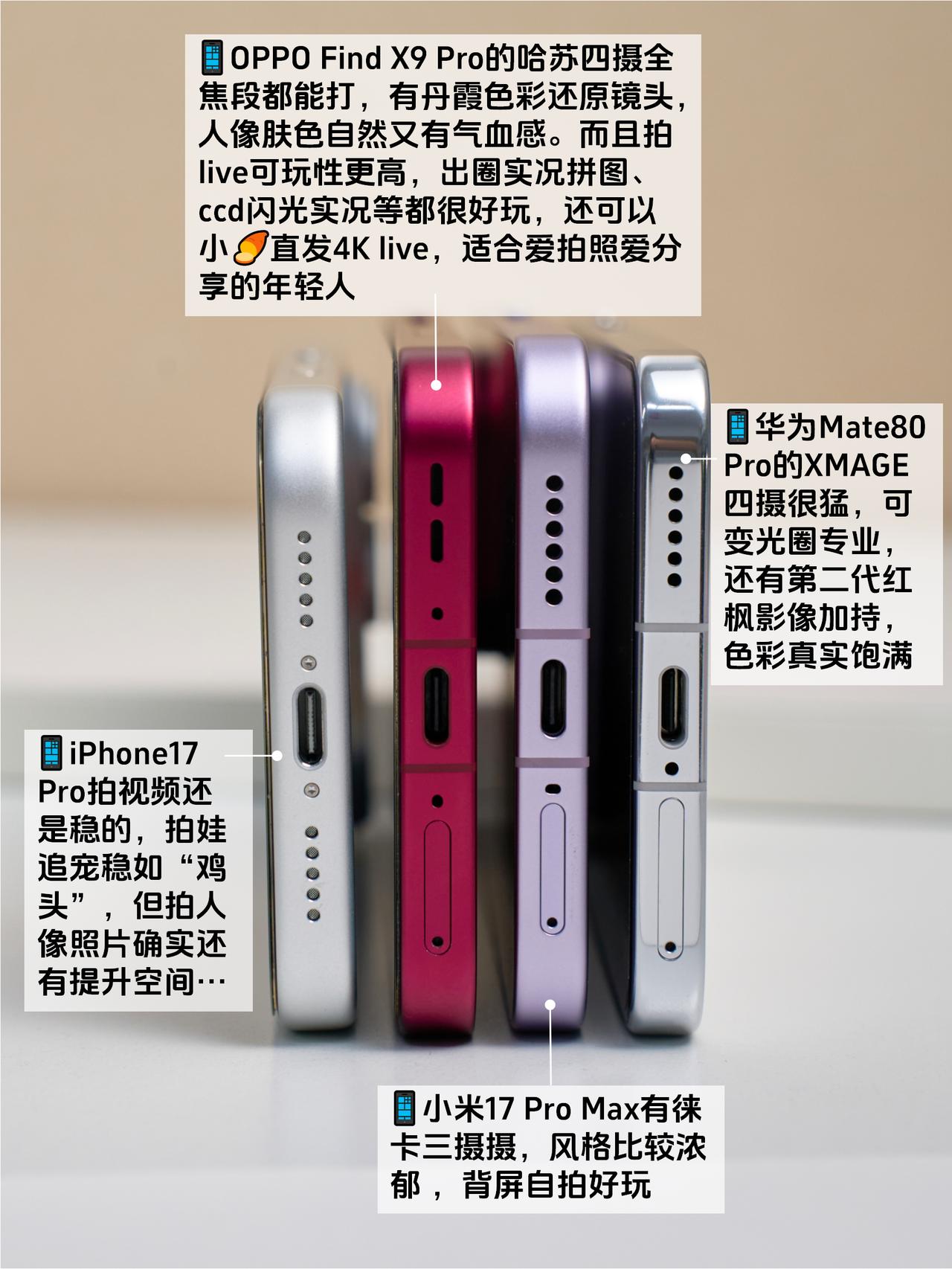 打工人年终奖怎么花?春节前想换大杯旗舰 纠结星人本人🙋🏻 公司破天荒发慈悲 年底奖💰到手,想赶春节前换个新手机 结果在iPhone17 Pro、小米17 Pro Max、华为Mate80 Pro、OPPO Find X9 Pro之间反复横跳… 看到后台好多朋友在问这四款大杯旗舰 今天就来吐血整理真实体验,直接抄作业👇 📸先说说我关注的影像 📱iPhone17 Pro拍视频还是稳的,拍娃追宠稳如“鸡头”,但拍人像照片确实还有提升空间… 📱小米17 Pro Max有徕卡三摄摄,风格比较浓郁 ,背屏自拍好玩 📱华为Mate80 Pro的XMAGE四摄很猛,可变光圈专业,还有第二代红枫影像加持,色彩真实饱满 📱OPPO Find X9 Pro的哈苏四摄全焦段都能打,有丹霞色彩还原镜头,人像肤色自然又有气血感。而且拍live可玩性更高,出圈实况拼图、ccd闪光实况等都很好玩,还可以小🍠直发4K live,适合爱拍照爱分享的年轻人 ⚡️至于影响整机体验的系统这块,四款旗舰可以说各有千秋 🍎iOS26稳定省心又流畅,适合苹果全家桶用户 鸿蒙6.0流畅度今非昔比,而且生态互联办公更方便 澎湃OS3功能比较丰富,还可以联动家电 ColorOS16足够流畅,还有各种AI功能加持 小布AI很实用,不仅能帮学文案、作ppt,还能记录日程、整理笔记👍 💰价格上,国产机型感觉比iPhone都要亲民一些 尤其OPPO,Find X9全系现在有国家补贴,还送定制礼盒+24期免xi,很适合想省心入旗舰的姐妹🤔 💡不知道大家春节前,想冲哪个? 旗舰手机iPhone华为小米OPPO Find X9 Pro