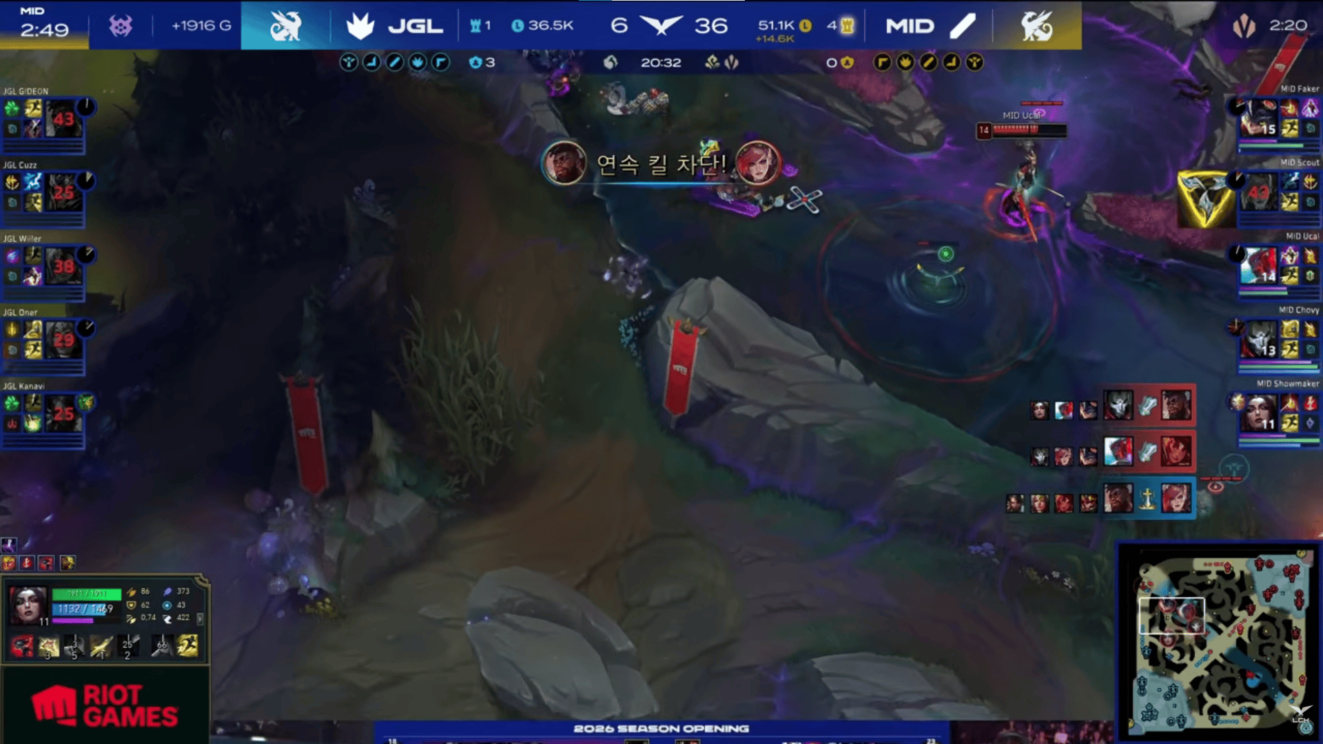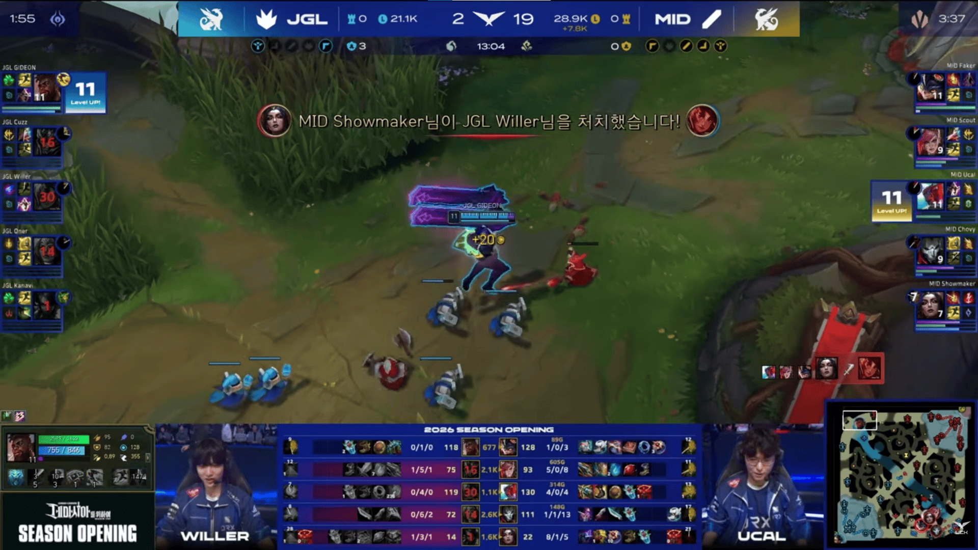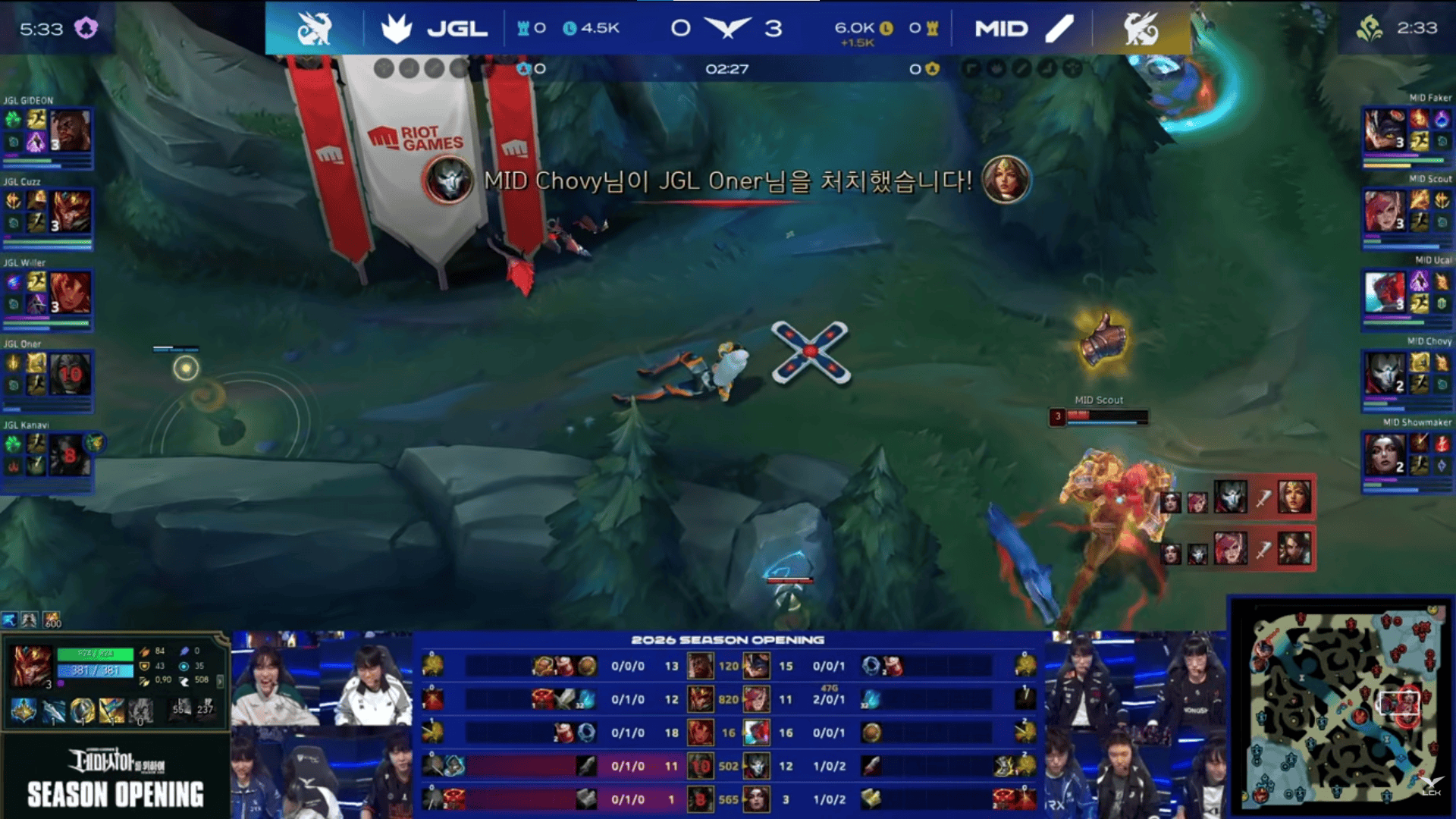 中单队选用:Faker兰博、Scout蔚、Ucal永恩、Chovy烬、ShowMaker妖姬