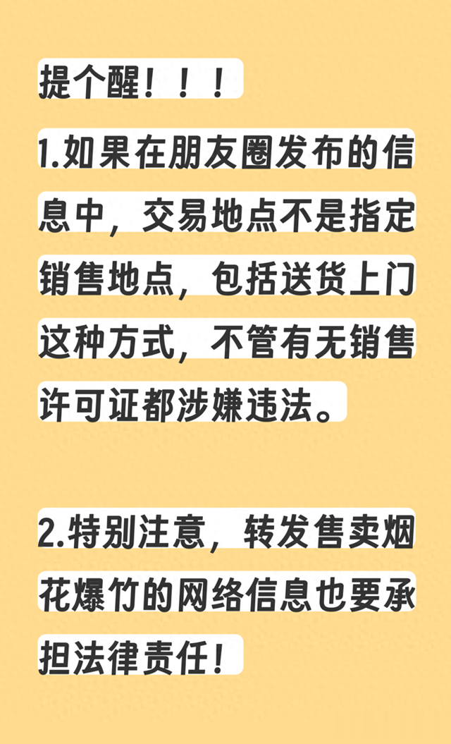 值得一提的是,如果在朋友圈发布的信息中,交易地点不是指定销售地点,包括送货上门这种方式,不管有无销售许可证都涉嫌违法。还需要特别注意,转发售卖烟花爆竹的网络信息也要承担法律责任!