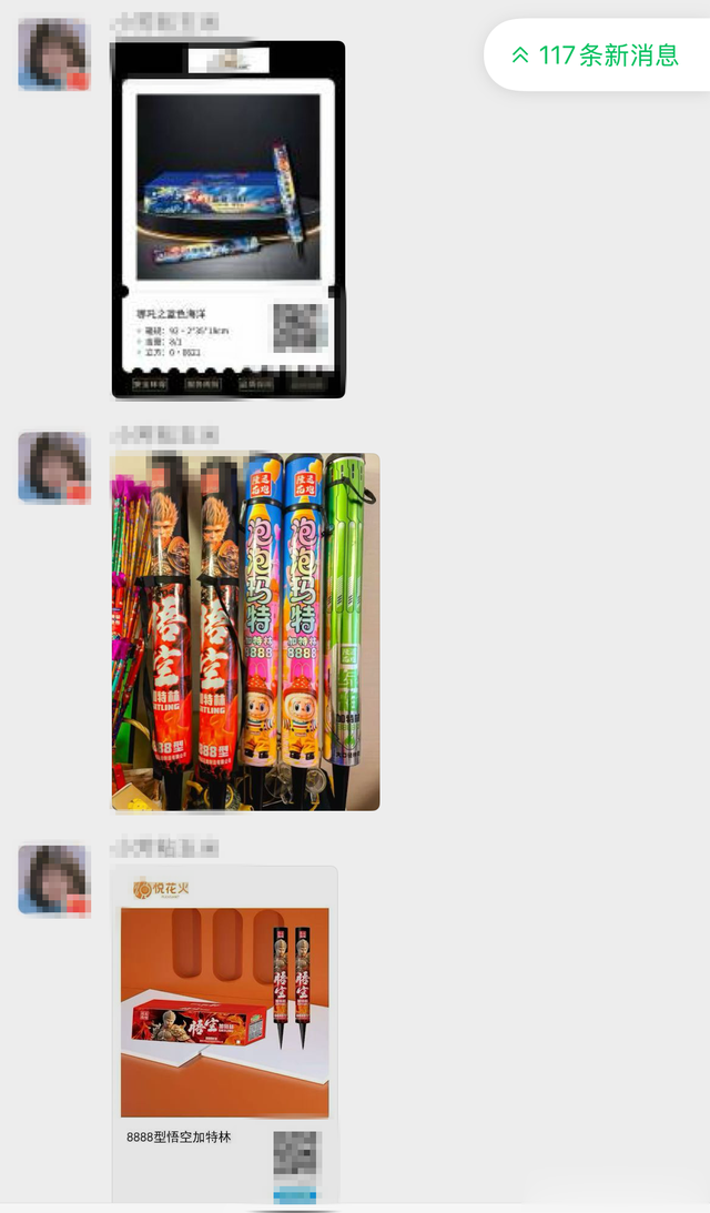 记者调查发现,在朋友圈销售烟花爆竹者多以社区群方式销售。销售的烟花爆竹主要分两类:一类是声称“安全环保”的冷光烟花、喷花类产品;另一类则是明确标注为“专业燃放”的大型组合烟花。售价从几十元到数百元不等,大多低于实体销售点价格。