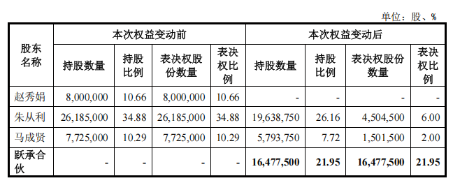 变更完成后,朱从利及赵秀娟合计持有26.16%股份,享有占公司股份总数6%的表决权,马成贤持有占公司股份总数的7.72%的股份,享有占公司股份总数的2%的表决权。跃承合伙持有公司1647.75万股股份,占公司股份总数的21.95%,相应享有该部分股份的表决权。跃承合伙成为格利尔新控股股东,实际控制人由朱从利、赵秀娟变更为凤阳县财政局。