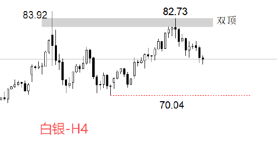 行情方面,四小时级别,白银形成了典型的双顶结构。83.92美元是历史最高点,82.73美元是次高点。两个价位相差不大,且所在K线均有长上影线特征,符合双顶结构的基本要求。下方支撑位在70.04美元,如果行情能够下跌至该价位,甚至有效突破70美元整数关口。那么,白银的逼空行情有望到此结束,未来有可能展开一轮明显会回调走势。