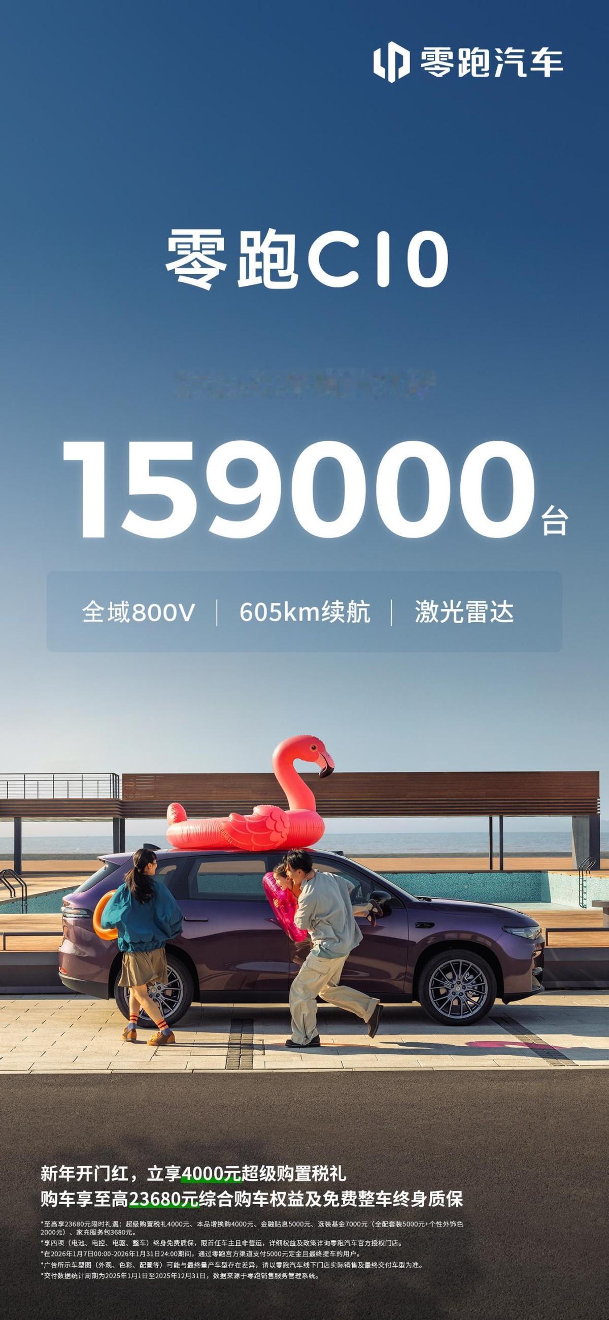 以后不能说是畅销国内了,零跑C10在全球都是爆款!   近日,零跑创始人朱江明接受了人民日报采访,他说红海竞争下要先练内功,靠全域自研做高质量产品、搞技术普惠,做长跑者跑出中国智造新路径。这一理念正是零跑快速崛起并畅销全球的核心密码。   相信大家都知晓,2025 年新势力阵营销量冠军被零跑汽车拿下,这个仅成立十年的车企,以年销量近 60 万台的绝对黑马之势登顶,国内畅销已是不争的事实。而最新数据显示,零跑的热度早已突破国界,蔓延全球,旗下零跑 C10 更是 “全球爆款” 的核心代表。2025 年零跑海外销量达 6 万台,稳稳占据新势力海外销量榜首,其中 C10 海外订单强势突破 1.2 万台,在对汽车品质要求极为严苛的德国市场,占比率高达 1.63%,成功实现欧洲 13 国同步热销,在海外竞争激烈的市场中跻身前列。   值得一提的是,C10 的价格优势极具吸引力,欧洲市场起售价约 25 万人民币,国内消费者却仅需 14 万就能入手顶配版本,花小钱就能享受全球统一的高品质标准,这在国内汽车市场发展多年来十分罕见。   更关键的是其越级的产品力,激光雷达、纯电 800V 架构等高端配置一应俱全,605Km 续航既能满足日常通勤,也能支撑长途出行需求。如今零跑 ABCD 产品线逐渐完善,加上国内外市场的同步发力,今年冲击百万销量的目标,无疑充满了希望!