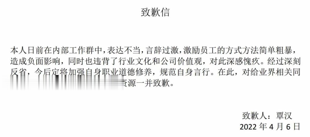 该言论在社交媒体持续发酵后,覃汉随即发布致歉信。他在信中表示:“本人日前在内部工作群中,表达不当,言辞过激,激励员工的方式方法简单粗暴,造成负面影响,同时也违背了行业文化和公司价值观,对此深感愧疚。经过深刻反省,今后定将加强自身职业道德修养,规范自身言行。在此,对给业界相关同仁造成的困扰和挤占网络话题资源一并致歉。”