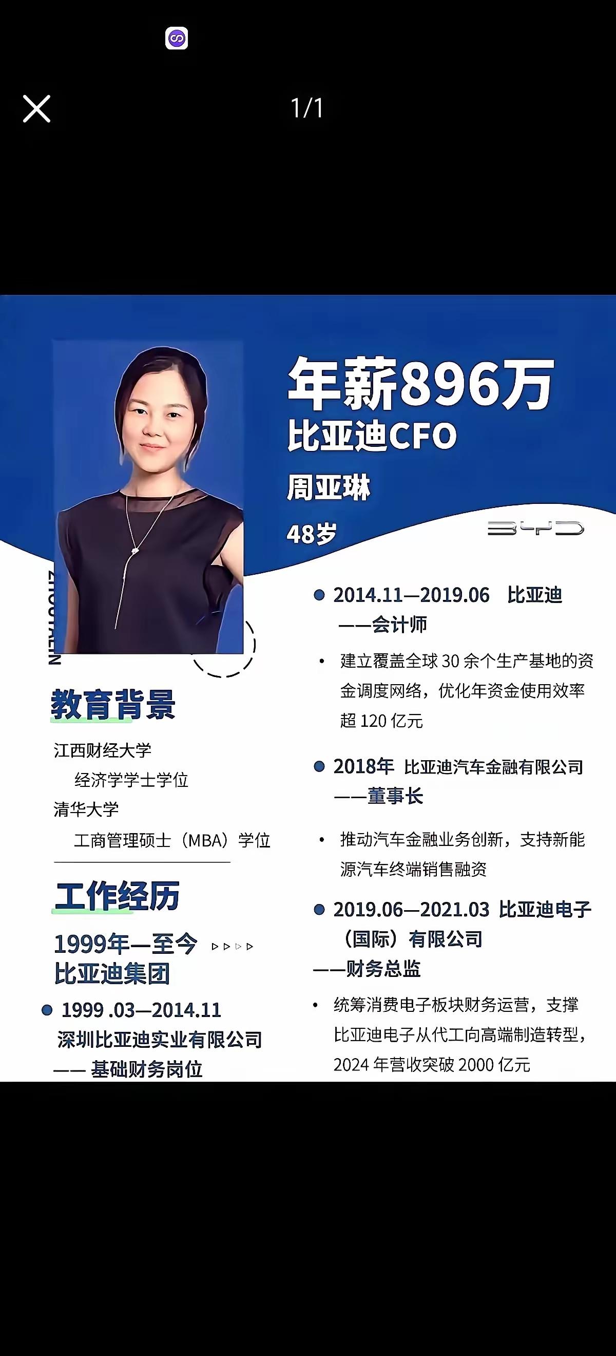 之前我一直奇怪一件事,一个名不见经传的小地方江西抚州为什么能得到比亚迪的青睐,能让它到这个地方投资建厂呢?原来这里面还有一层不为外人所知的关系。首先是一个契机,抚州当地刚好有一个刚刚建好了的叫大乘汽车的公司倒闭了。 而负责比亚迪收购业务的是年薪达896万的比亚迪CFO(首席财务官)周亚琳。 周亚琳的老家正好是江西抚州。 周亚琳发达了没有忘记家乡,在天时地利人和之下,比亚迪收购了这家公司。 比亚迪盘活这家公司之后,现在已经解决了当地3万人的就业。 而比亚迪的目标是在未来解决5万到10万人的就业。 看来一个小地方出来一个能人,对当地简直就是福报。 备注:CFO,是英文Chief Financia Officer的简称,即首席财务官。