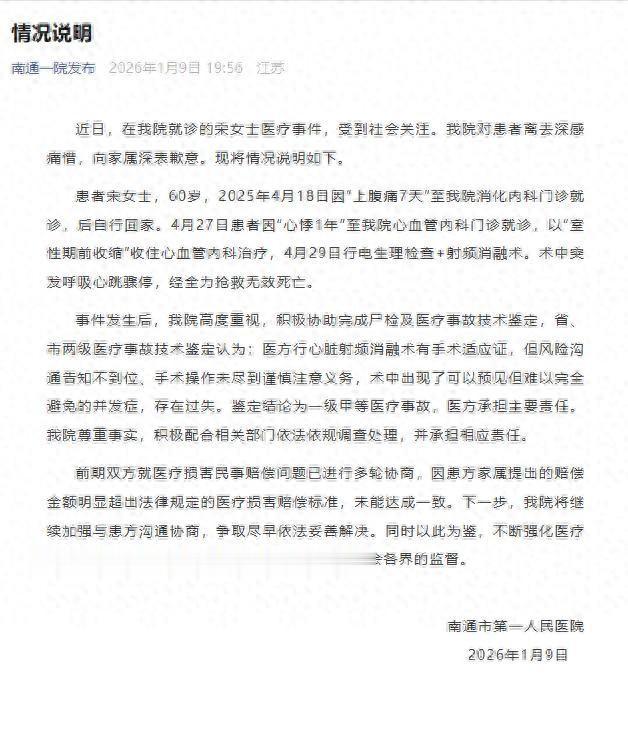 事件发生后,我院高度重视,积极协助完成尸检及医疗事故技术鉴定,省、市两级医疗事故技术鉴定认为:医方行心脏射频消融术有手术适应证,但风险沟通告知不到位、手术操作未尽到谨慎注意义务,术中出现了可以预见但难以完全避免的并发症,存在过失。鉴定结论为一级甲等医疗事故,医方承担主要责任。我院尊重事实,积极配合相关部门依法依规调查处理,并承担相应责任。