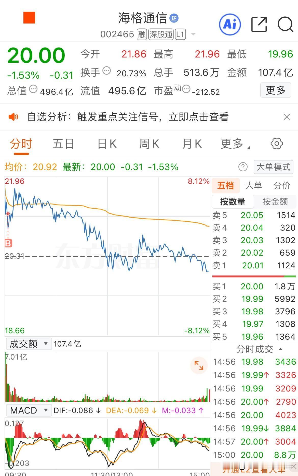 再也不追高了,今天血亏! 今天一共追了两个,没想到两个居然都从大涨到翻绿,真的是绝了! 一个是东方日升,7个点追进去的。没想到刚买进去就起飞了,一路拉升到了12个点!但还没来得及高兴,拉升就结束了,随之而来的是快速回调,很快就跌到了成本线以下,然后又不断下跌,最低的时候一度跌了快5个点,真的是无语至极! 另一个是海格通信,这个其实昨天就已经进了点底仓。没想到昨晚商业航天又出了利好,而且和海格通信直接相关,今天也是直接高开7个多点! 只是它并没有高开秒板,而是在开盘后迅速回调,我以为这是在洗盘,于是在4个点左右加了仓。虽然后来它又回到了开盘价附近,但是此后就也走上了漫漫的下跌路,即便是其余的商业航天概念全部起飞,它也无动于衷,最终收跌1.53%! 今天真的是太无语了,追了两个都最后低走了!以后还是玩我的抄底吧,追高风险太大了。