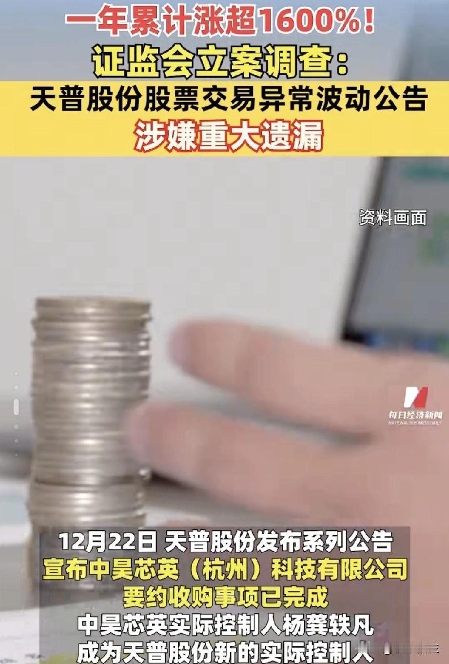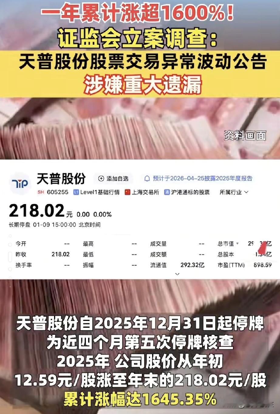大雷! 16倍大牛股天普凉凉了? 从8月22日市值不足40亿直线飙升292.32亿。股价涨至218.02元, 今晚某会已对天普股票交易异常波动公告涉嫌重大遗漏立案调查。在里面的股友还好吧! 这是对那些纯粹炒作的高标一个警示,这种传花击鼓的游戏一定要小心了。大盘已经16年连阳了,下周一对那些高标都要小心了。可能随时都是最后一棒,高处不胜寒啊!