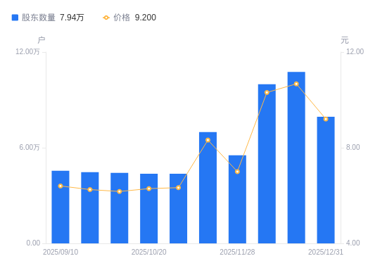 日期A股户数(户)流通A股户均持股数(股)户均持股市值(万元)2025-12-31794429091.798.362025-12-201075896713.237.162025-12-10998387234.427.462025-11-285528113065.439.152025-11-106982010344.758.612025-10-314369916528.3010.462025-10-204365916543.4410.412025-09-304422416332.0910.082025-09-194466716170.1110.112025-09-104559115842.3910.14