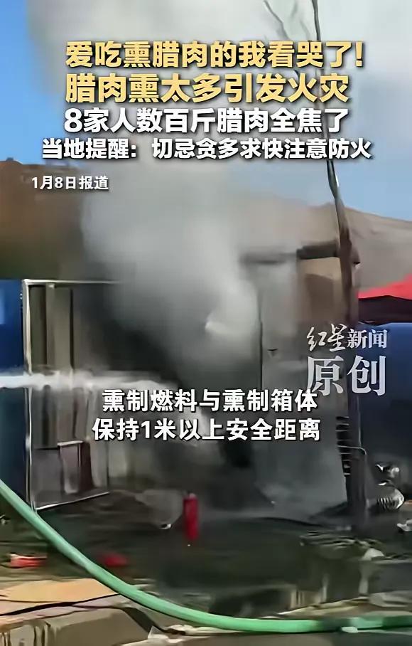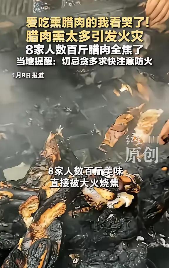 悲剧还是发生了!1月6日,四川南充,8户人家在熏腊肉时,为了快一点,就把数百斤腊肉都放进了熏腊肉的设备里面,结果因为太多腊肉滴油,导致设备突然起火,腊肉全被烧焦,一眼望去全是残骸,让人非常心疼。网友:爱吃腊肉的我哭了! 川渝一带的人对熏腊肉的执念,那是刻在骨子里的。临近年关,家家户户都要熏上几十上百斤腊肉、腊香肠,既是年夜饭的硬菜,也是走亲访友的伴手礼。南充这8户人家估摸着也是想赶在年前把腊味都熏好,想着一次多放些腊肉能少跑几趟,省点功夫,哪曾想贪多求快的心思,直接让大半年的准备打了水漂。 现场的画面看着就让人揪心,熏制设备被大火烧得黢黑,原本油光锃亮的腊肉变成了一块块焦黑的残骸,地上还淌着融化的油脂和灭火的水渍。这些腊肉可不是简单的食材,是农户们从选肉、腌制到晾晒,一步步忙活出来的心血,几百斤肉的成本不说,那份盼着过年吃腊味的欢喜,也跟着大火烧没了。更后怕的是,这场火要是没及时控制,不光是腊肉没了,周边的房屋、设施都可能被牵连,到时候损失就不是几百斤肉能比的了。 说到底,这场火灾完全是可以避免的。熏腊肉的老辈人都知道,熏制时肉不能堆太密,油脂滴落的地方要远离火源,可这8户人家偏偏抱着“省事”的想法,把安全抛在了脑后。其实不只是熏腊肉,生活里很多安全事故,都是因为这种“图快、图省”的侥幸心理。总觉得“哪有那么巧出事”,却忘了火灾、意外从来都是盯着这些疏忽的时刻。当地后续也特意提醒,熏制燃料和箱体要保持1米以上安全距离,这不是凭空定的规矩,都是一次次教训总结出来的。 网友们的感慨也特别真实,有人说“隔着屏幕都觉得心疼”,也有人调侃“这下好了,直接熏成炭烧腊肉了”,玩笑背后其实是对这份损失的惋惜。年关将至,置办年货、准备腊味都是开心事,可安全永远得放在第一位,别让贪多求快的念头,毁了过年的好心情。 各位读者你们怎么看?欢迎在评论区讨论。