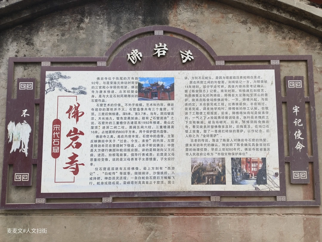 佛岩寺,又名佛崖寺,位于重庆市永川区陈食镇正街尾的万寿路92号。据史料记载,南宋时期有师徒二人在此雕刻佛像,因比赛工期引发悲剧,师傅后悔之余凿龛塑造“金砖菩萨”以作纪念,这一传说为佛岩寺增添了人文色彩。其石窟艺术与大足石刻一脉相承,1988年被列为重庆市文物保护单位。1992年新建三重檐仿古建筑保护窟内造像,同时新建部分彩塑佛像。