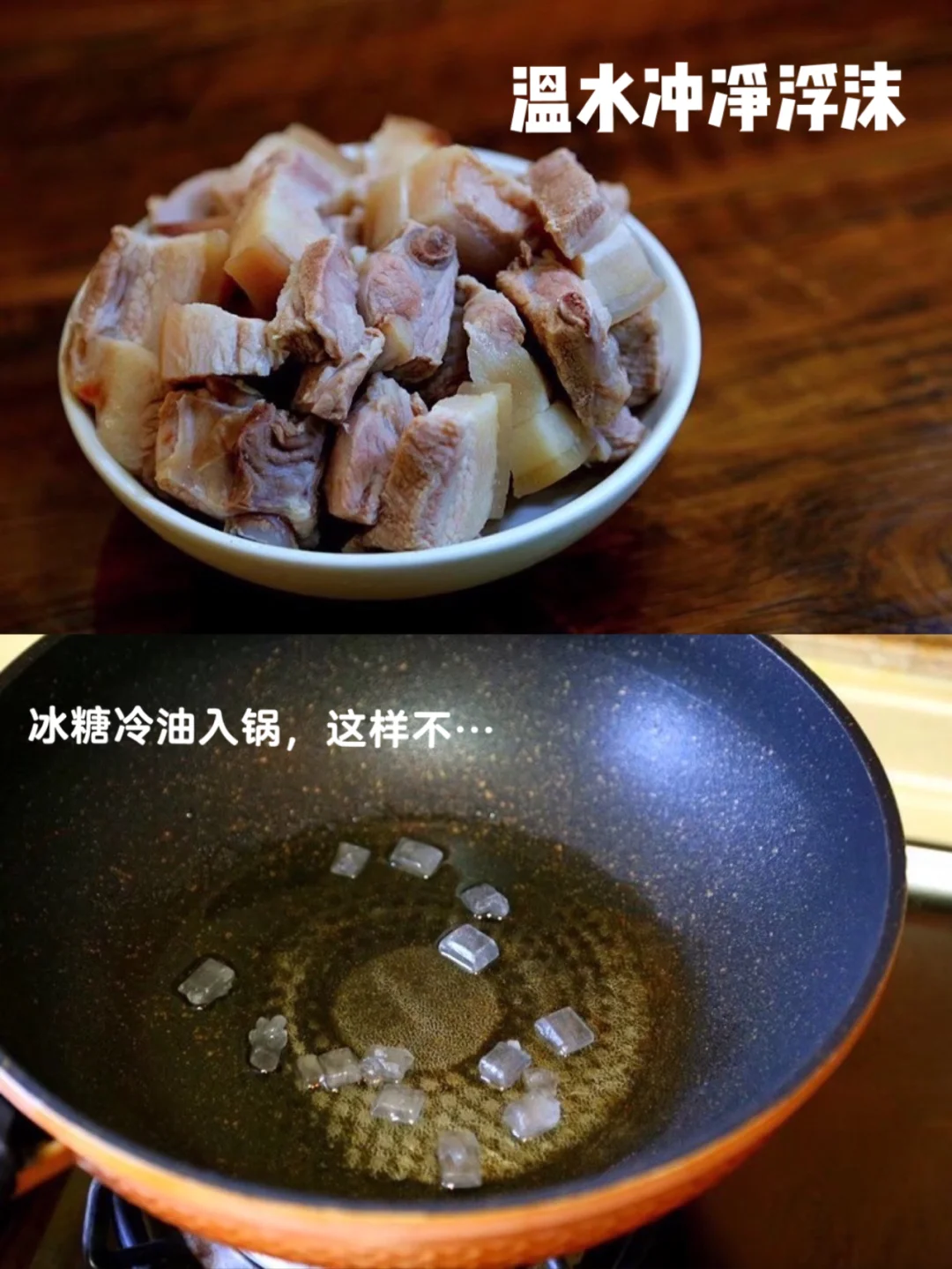 7.冷油入锅,马上放入冰糖 小火慢慢熬制融化成黄褐色,