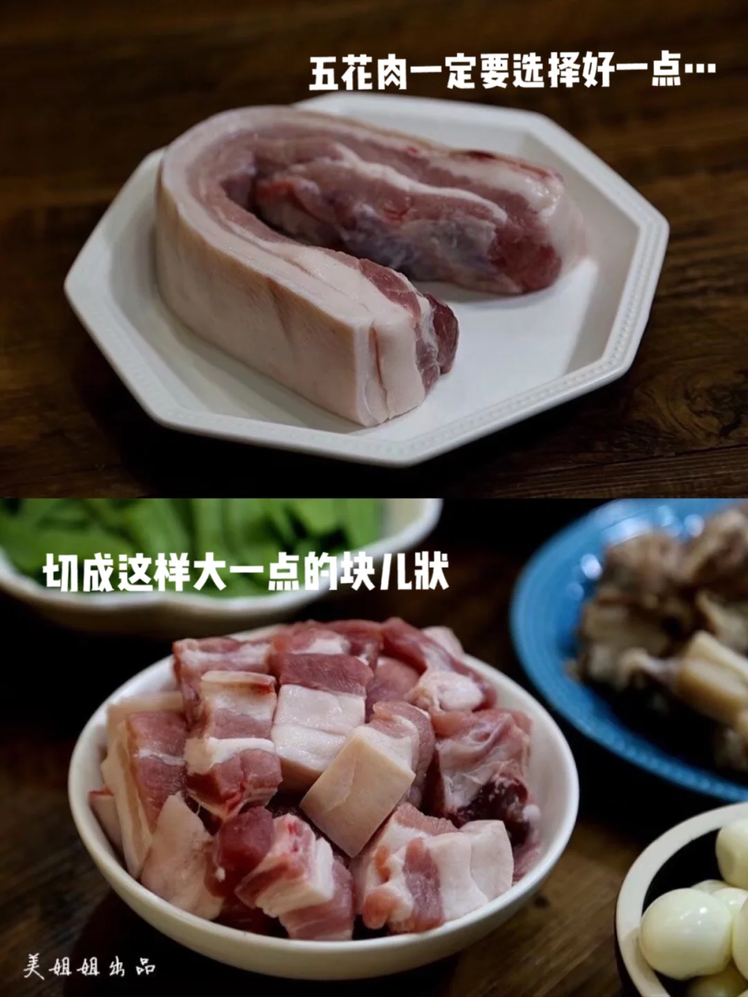 1.做红烧肉的话肉的选材蛮关键的 我一般去超市看见好的五花肉我就停不下来了 准备一块好的五花肉