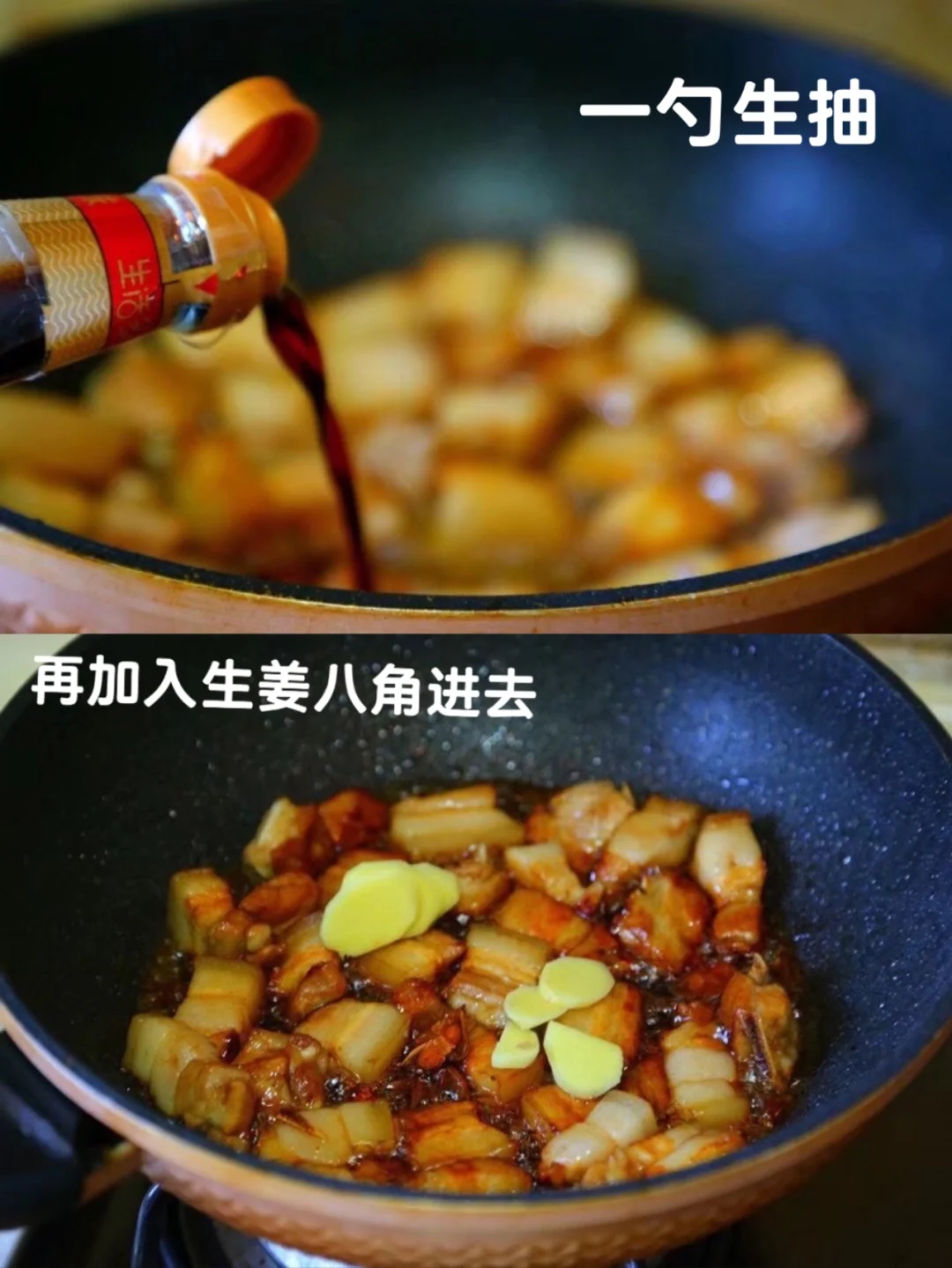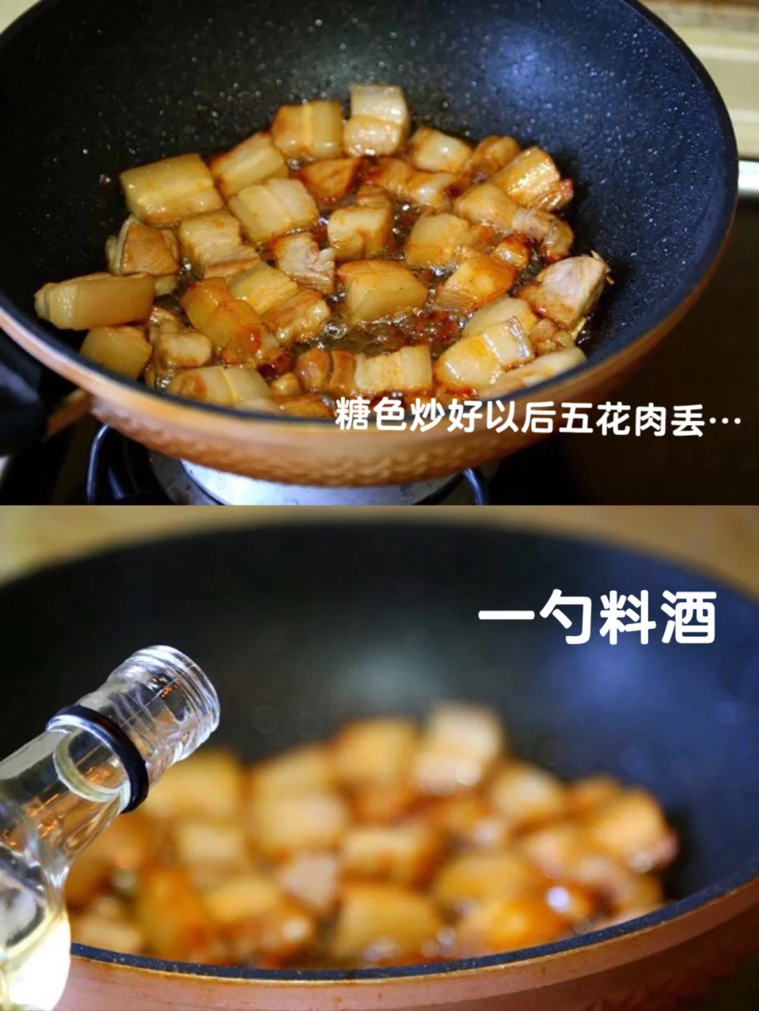 8.倒入沥干水的五花肉块,小心油溅到手上哦 快速翻炒至肉块都染上色
