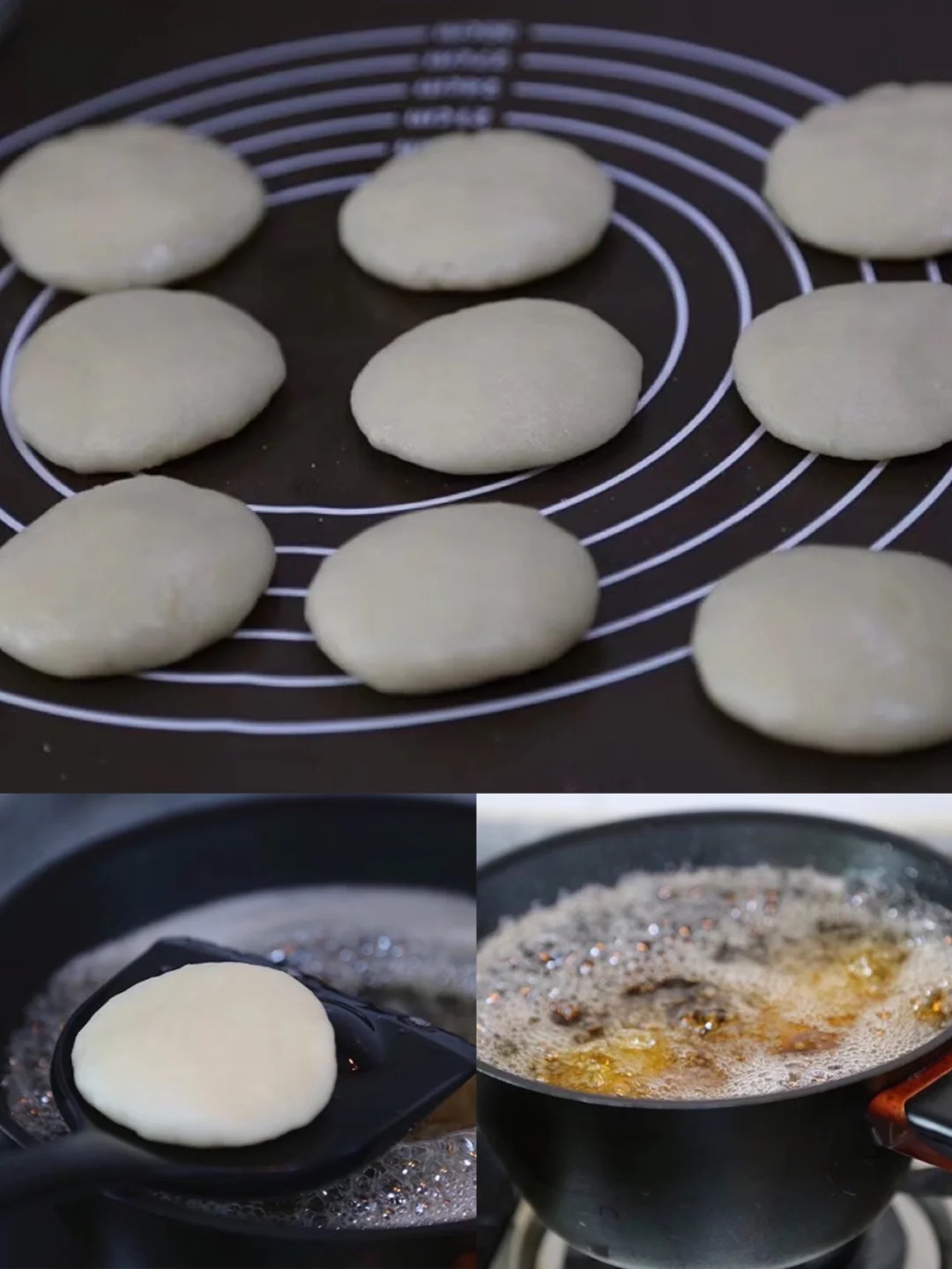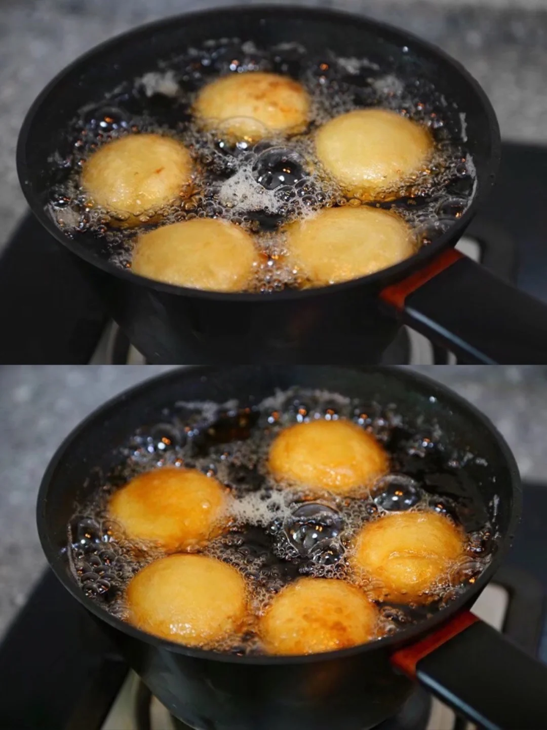 15.油温大概五六成热的时候加入炸锅里,锅铲上抹油一个个慢慢的放进去 [小锅省油,一次炸四到五个,多了会黏在一起]