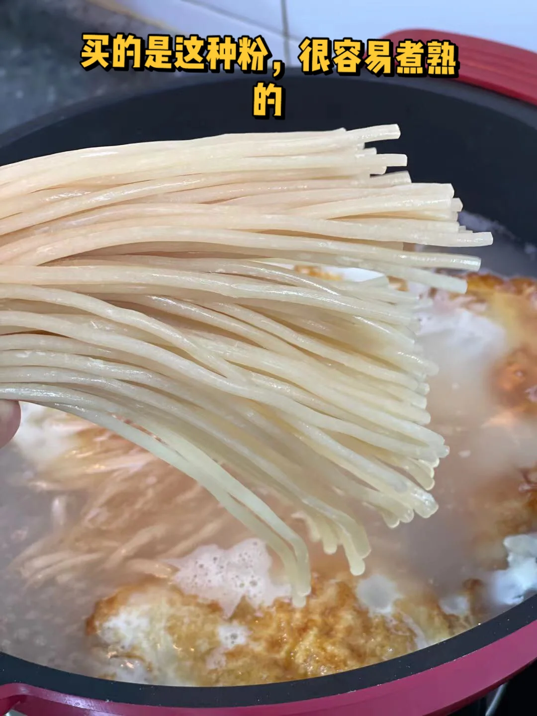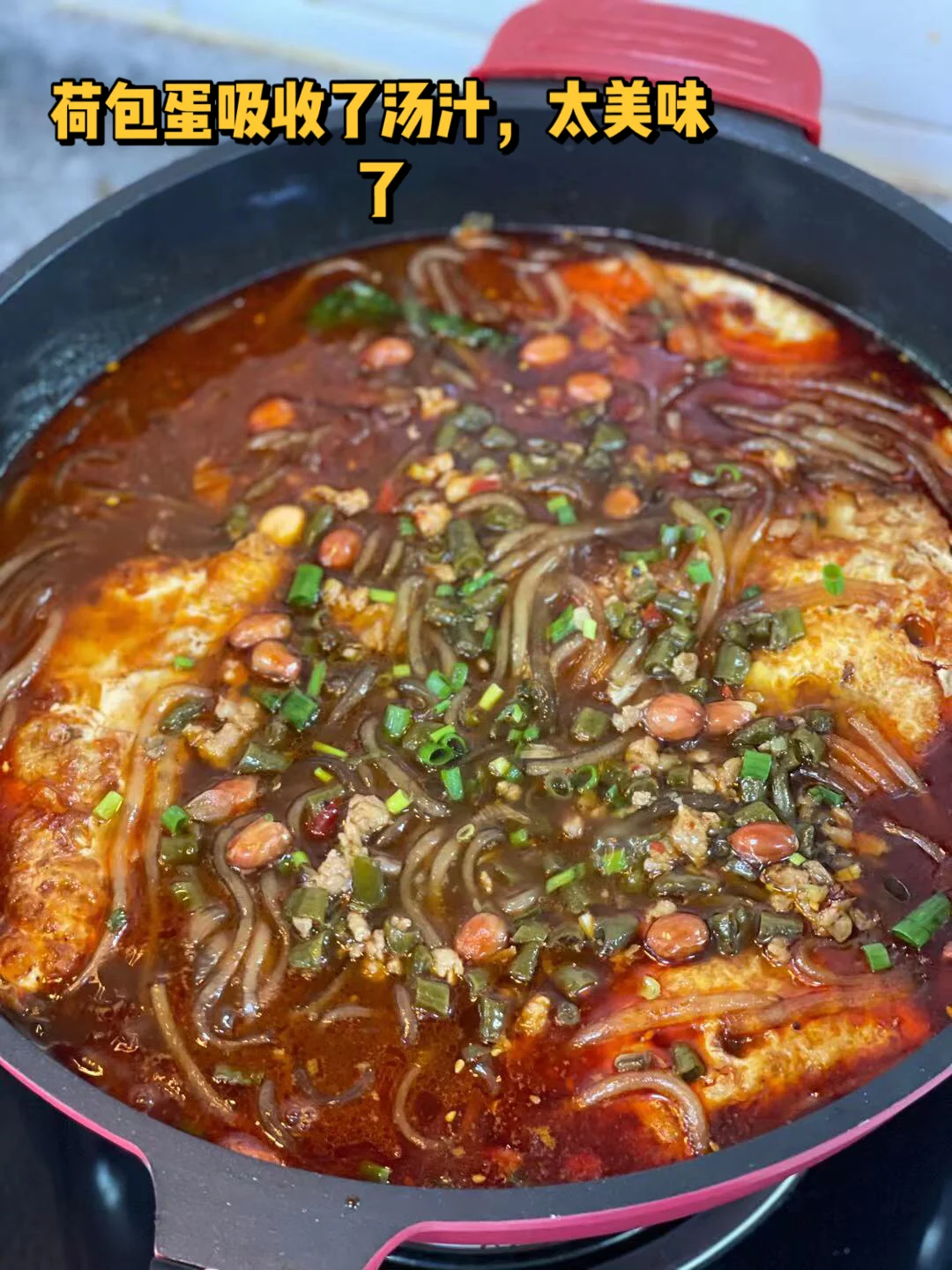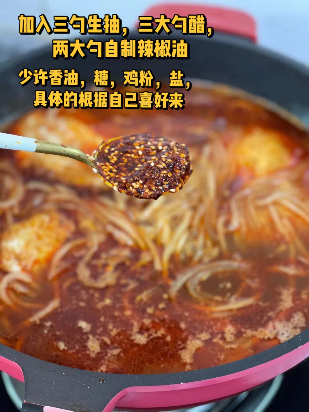 7.酸辣粉丢进去这个粉三四分钟就熟了,加入三勺生抽,三大勺香醋,两大勺自制辣椒油,少许香油,糖,鸡粉,盐,具体的根据自己的喜好来哈不绝对