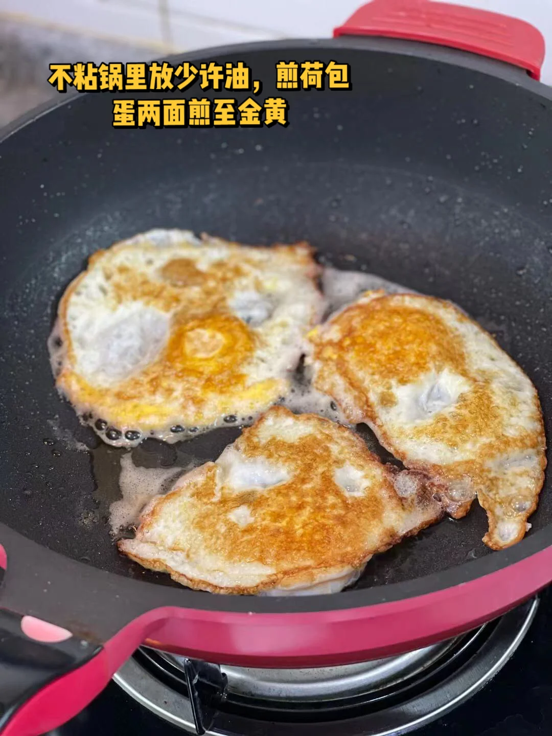 5.不粘锅里少许油,鸡蛋打进去煎三个荷包蛋