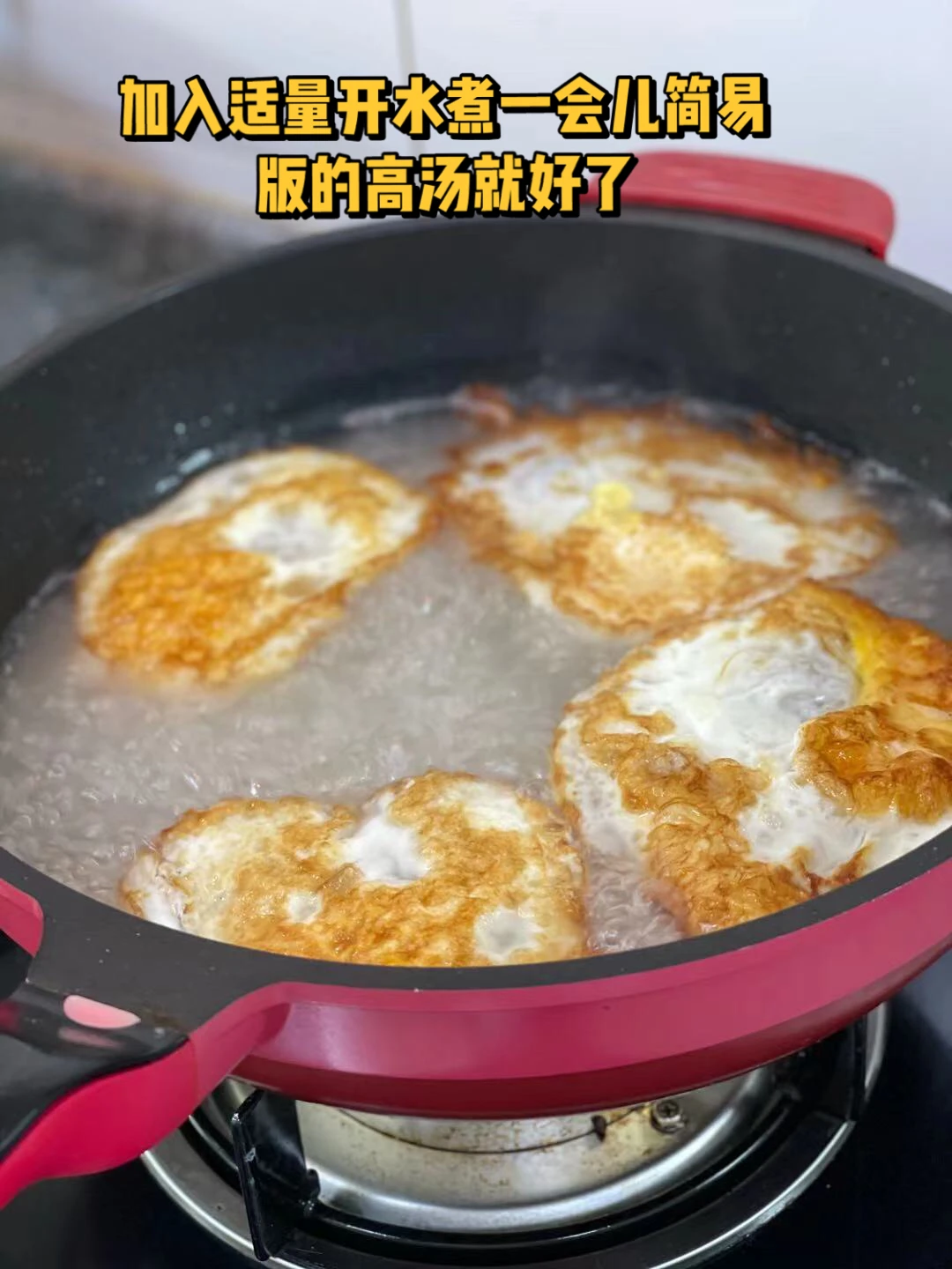 6.加入适量开水,家里没有熬高汤的时候可以试试这个方法,很方便快捷,煮一会儿成奶白色就可以了