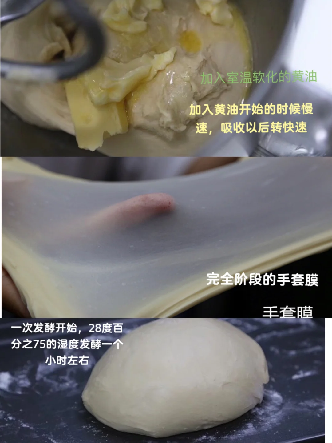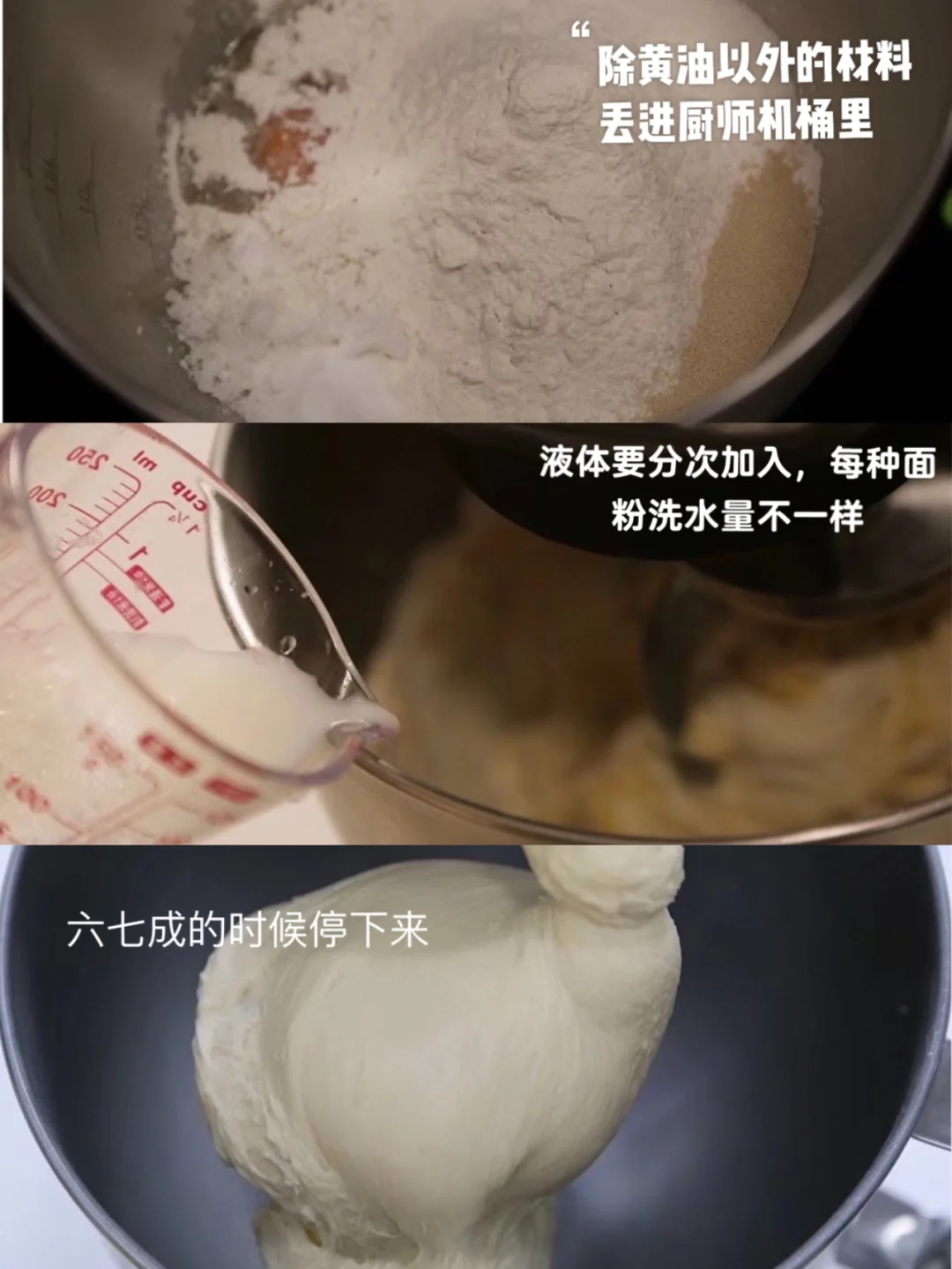 2.注意酵母不能和糖,盐放在一起 另外挖一个坑酵母丢进去即可 除了黄油其他的都丢进去