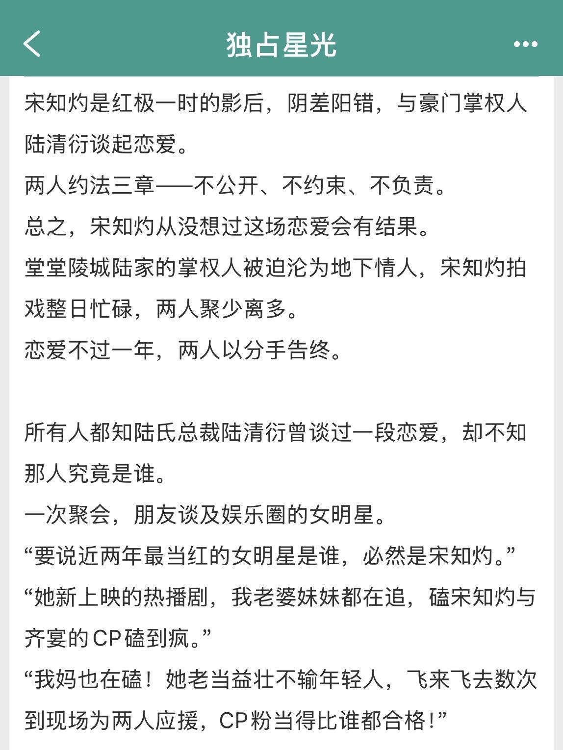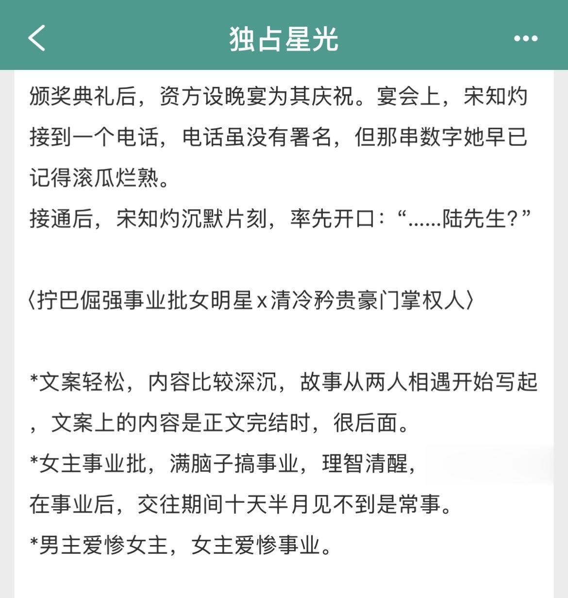 事业型女明星vs清冷矜贵掌权人!事业型女明星vs清冷矜贵掌权人! ※女主事业型,满脑子搞事业,理智清醒,男主只能排在事业后。 ※男主爱惨女主,女主爱惨事业。 书名:《独占星光》 作者:儿喜 标签:现言小说、甜文、娱乐圈文、完结文