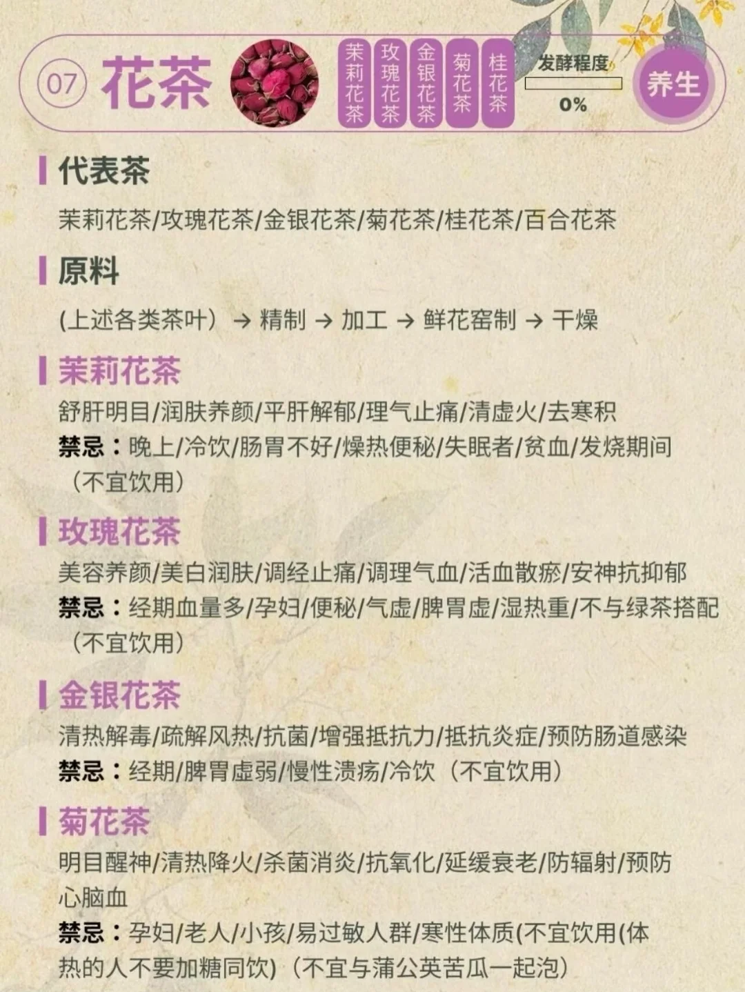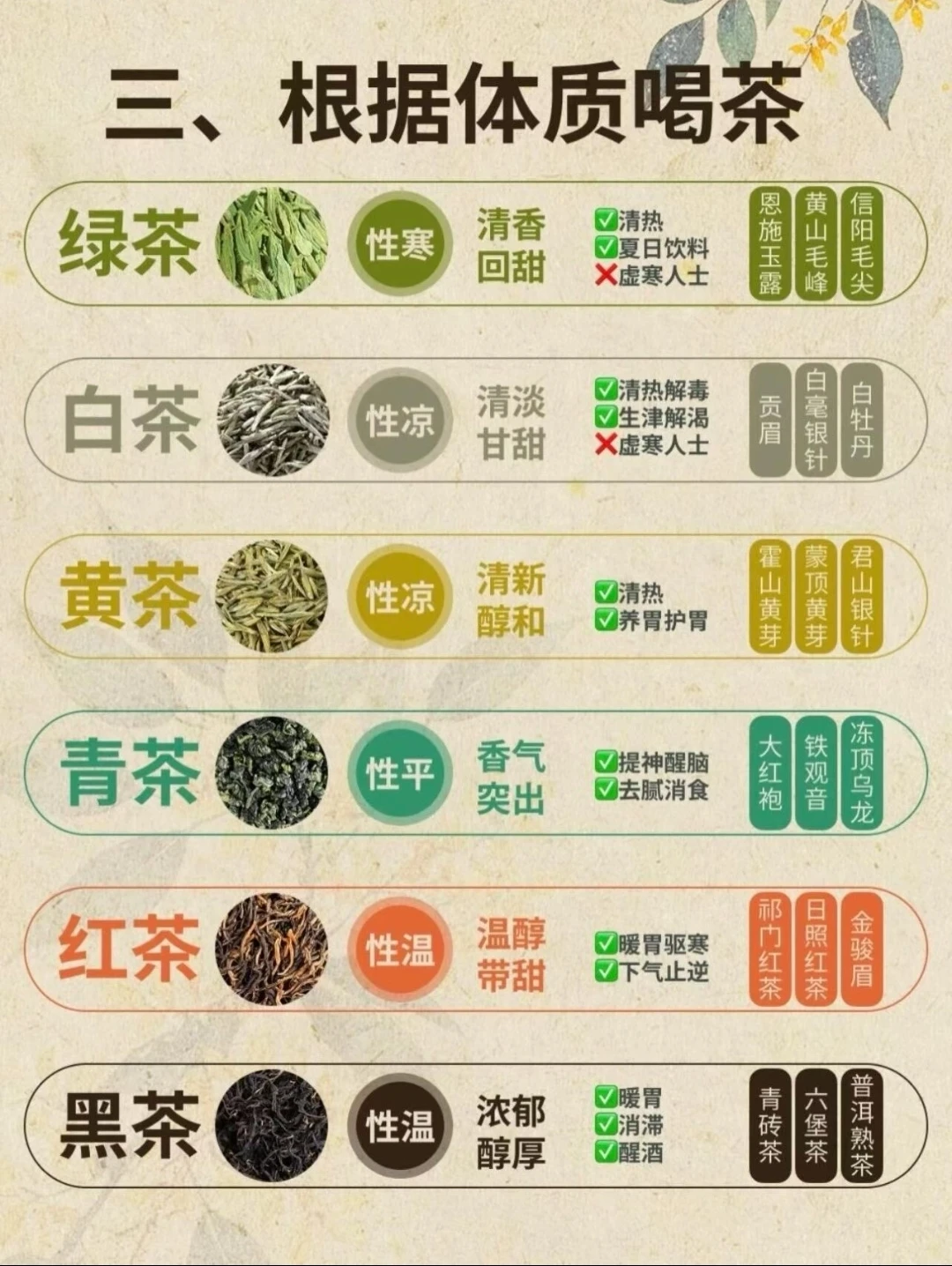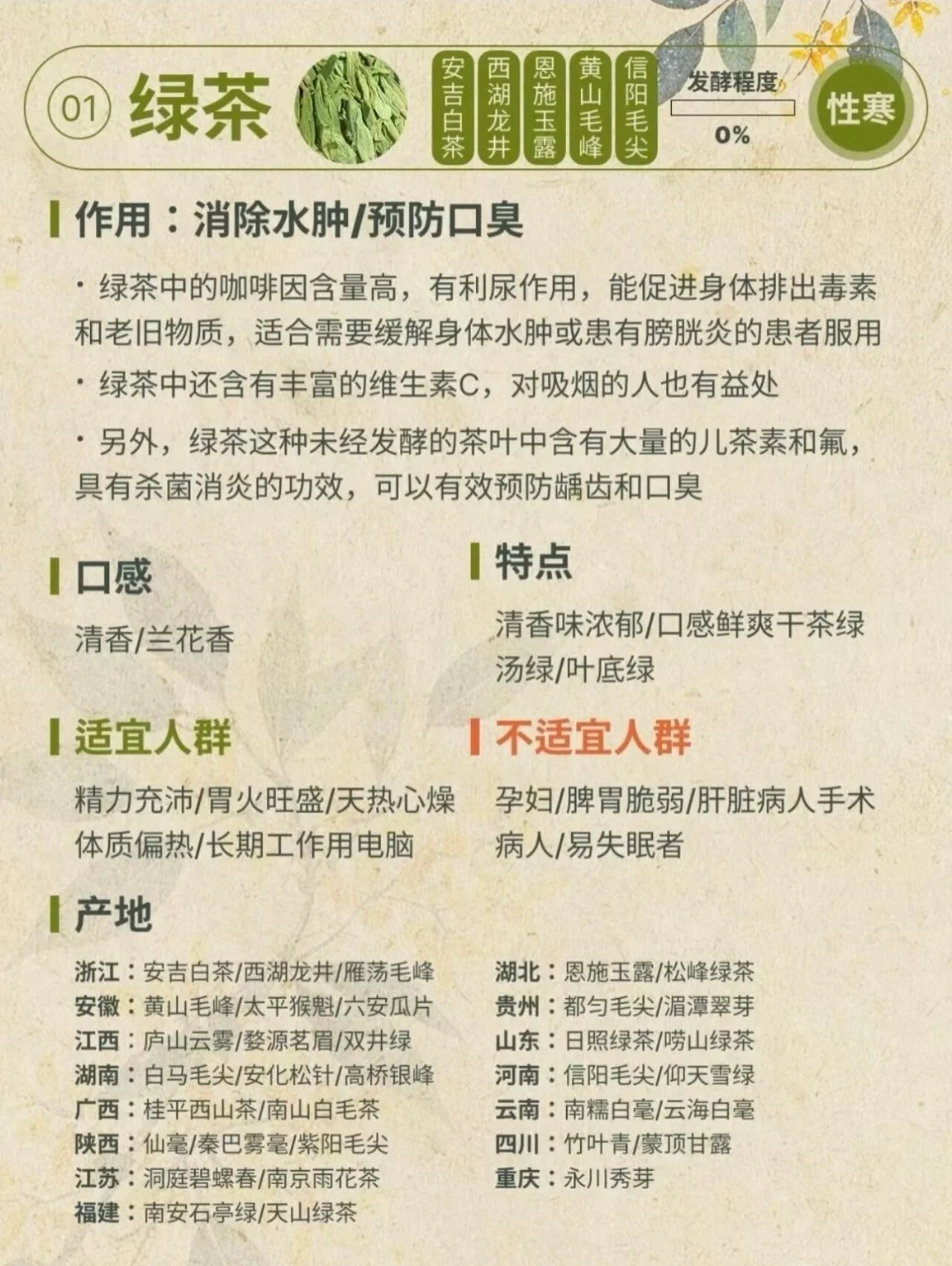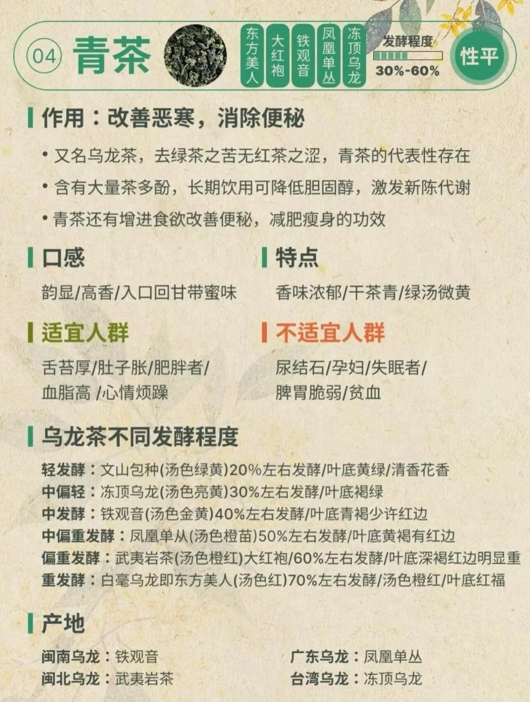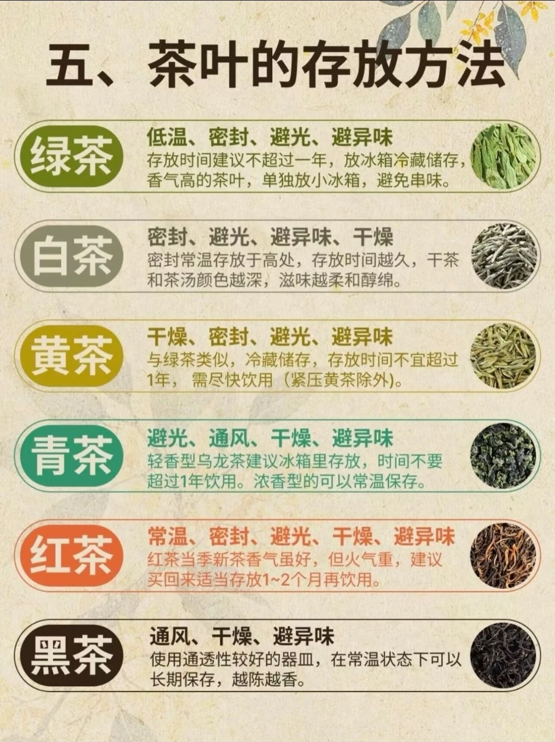 这是茶最基础的分类,关键看制作中“发酵”的程度,直接影响味道和颜色。