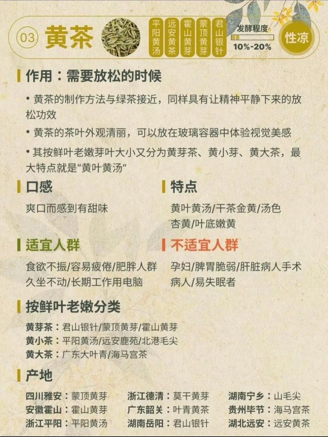 - 黄茶:轻发酵,甘醇柔和。君山银针最有名,产量少,喝到算“小幸运”。