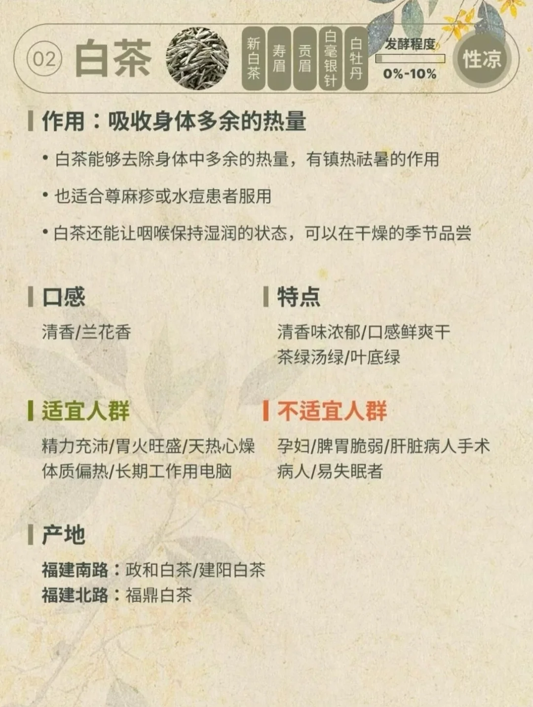 - 白茶:微发酵,滋味清甜。白毫银针、白牡丹是典型,越陈越香,储存时注意干燥防潮。