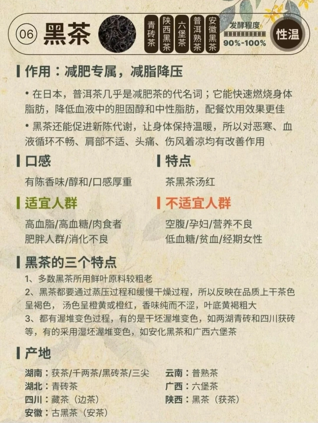 - 黑茶:后发酵,醇厚回甘。普洱熟茶、安化黑茶在此列,可长期存放,口感会慢慢变化。
