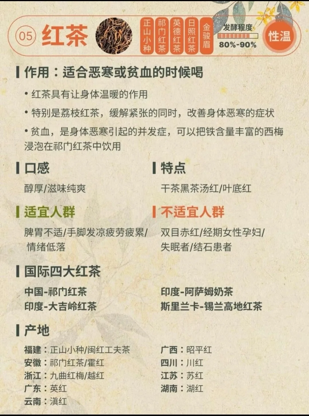 - 红茶:全发酵,甜润温和。祁门红茶、正山小种是代表,适合加奶或蜂蜜,冬天喝暖身。