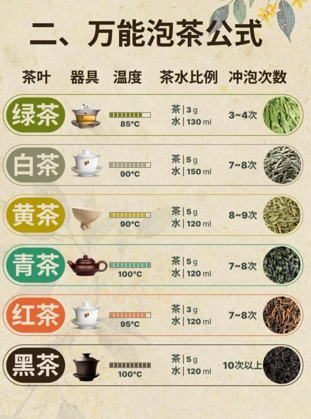 2. 水温:绿茶、白茶用80-90℃水,红茶、黑茶、乌龙茶用95-100℃沸水。